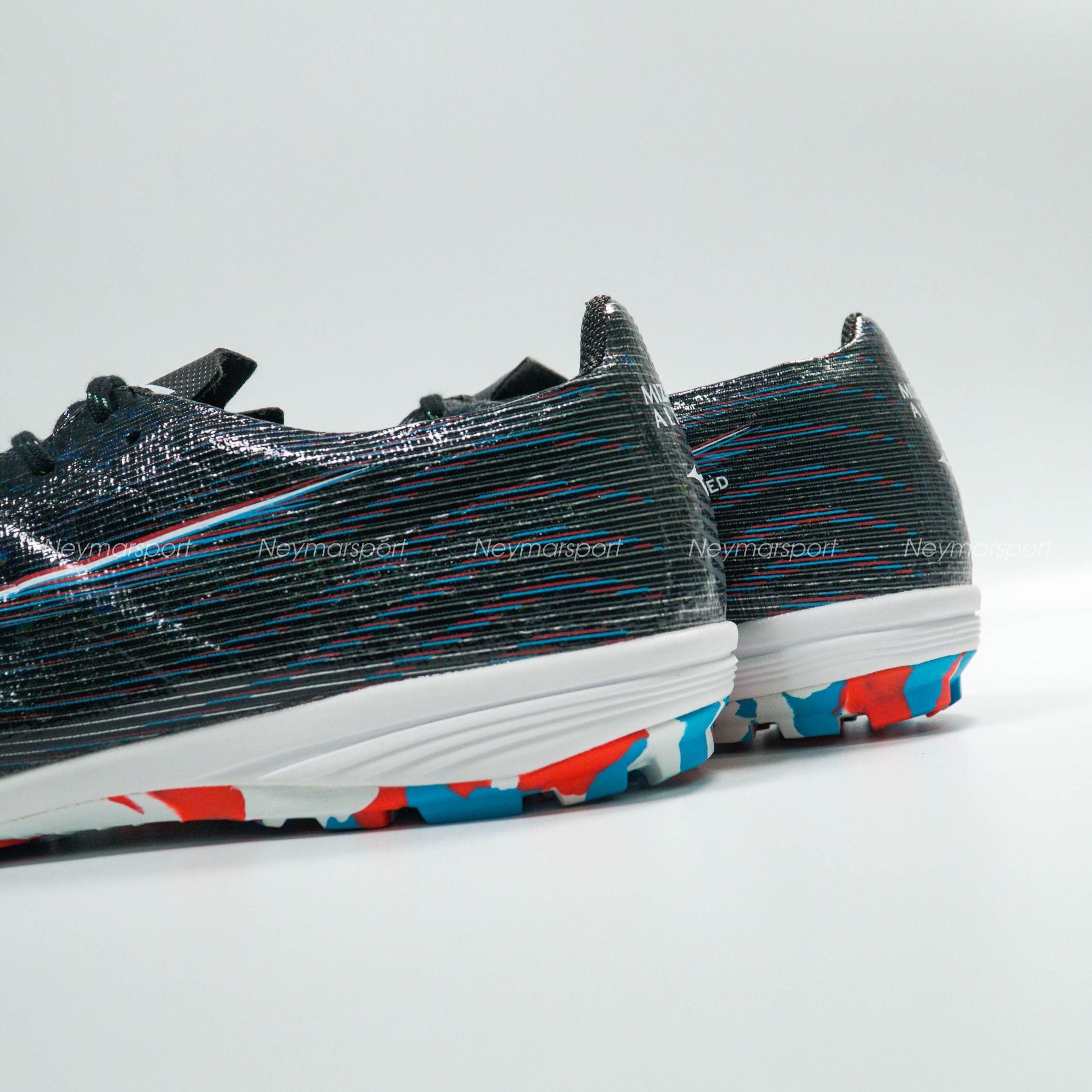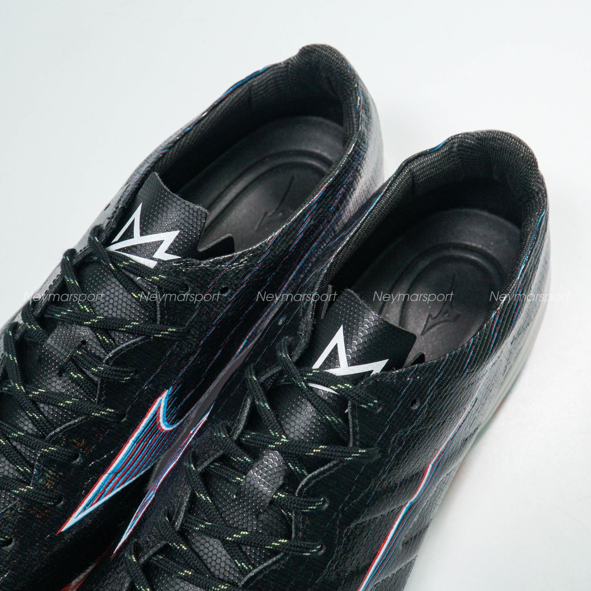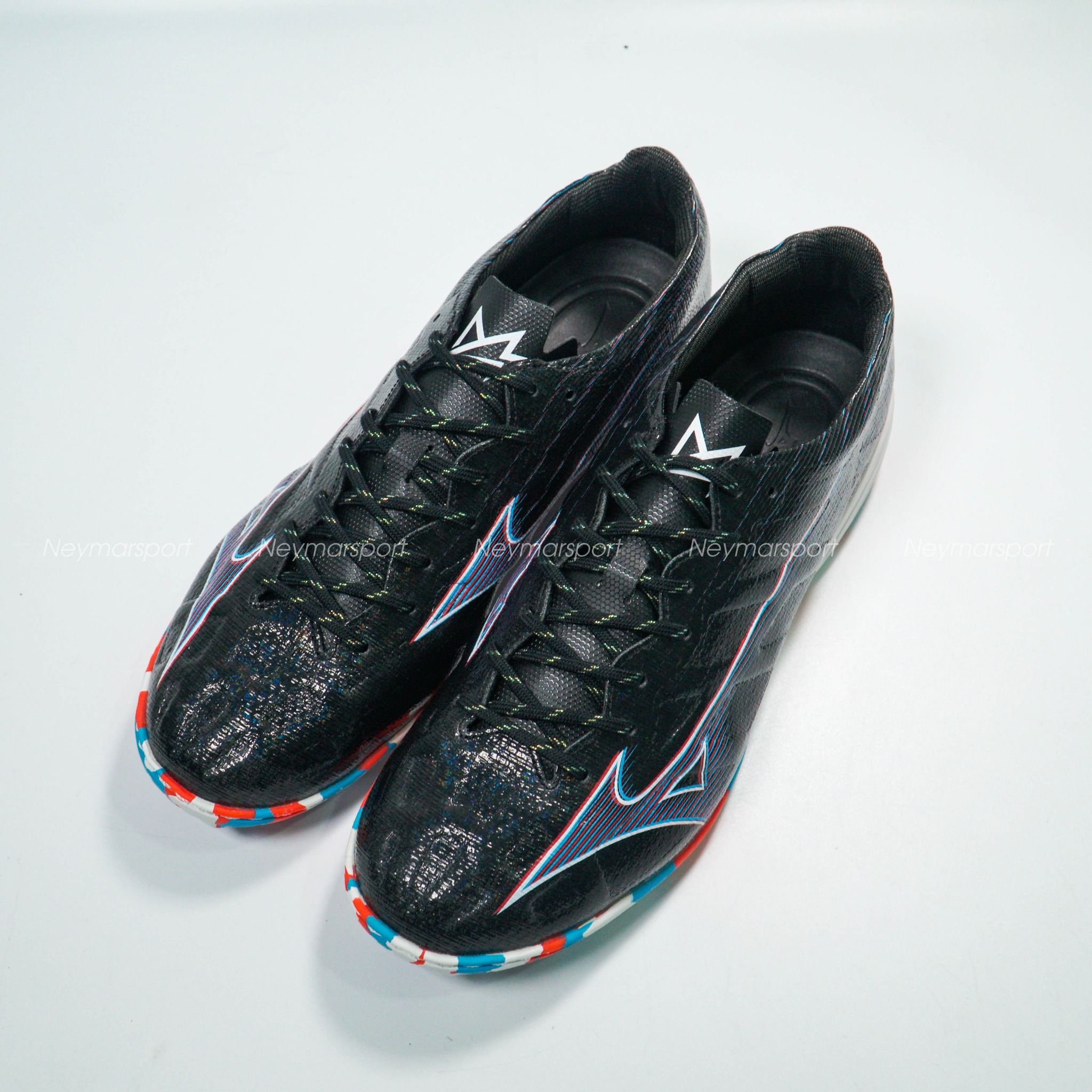 Mẫu giày đá bóng Mizuno Alpha lần này được phối bởi các gam màu Black/Purple/Red. Trên nền màu đen, logo của Mizuno được làm nổi bật bởi sự kết hợp màu tím và màu trắng, sau đó sử dụng đồ họa để phổ ra các vệt màu nhạt chạy dần về phía gót giày. Thiết kế độc đáo này mang đến cảm giác tốc độ sẵn sàng bùng nổ trong những đường chạy bóng bứt phá.