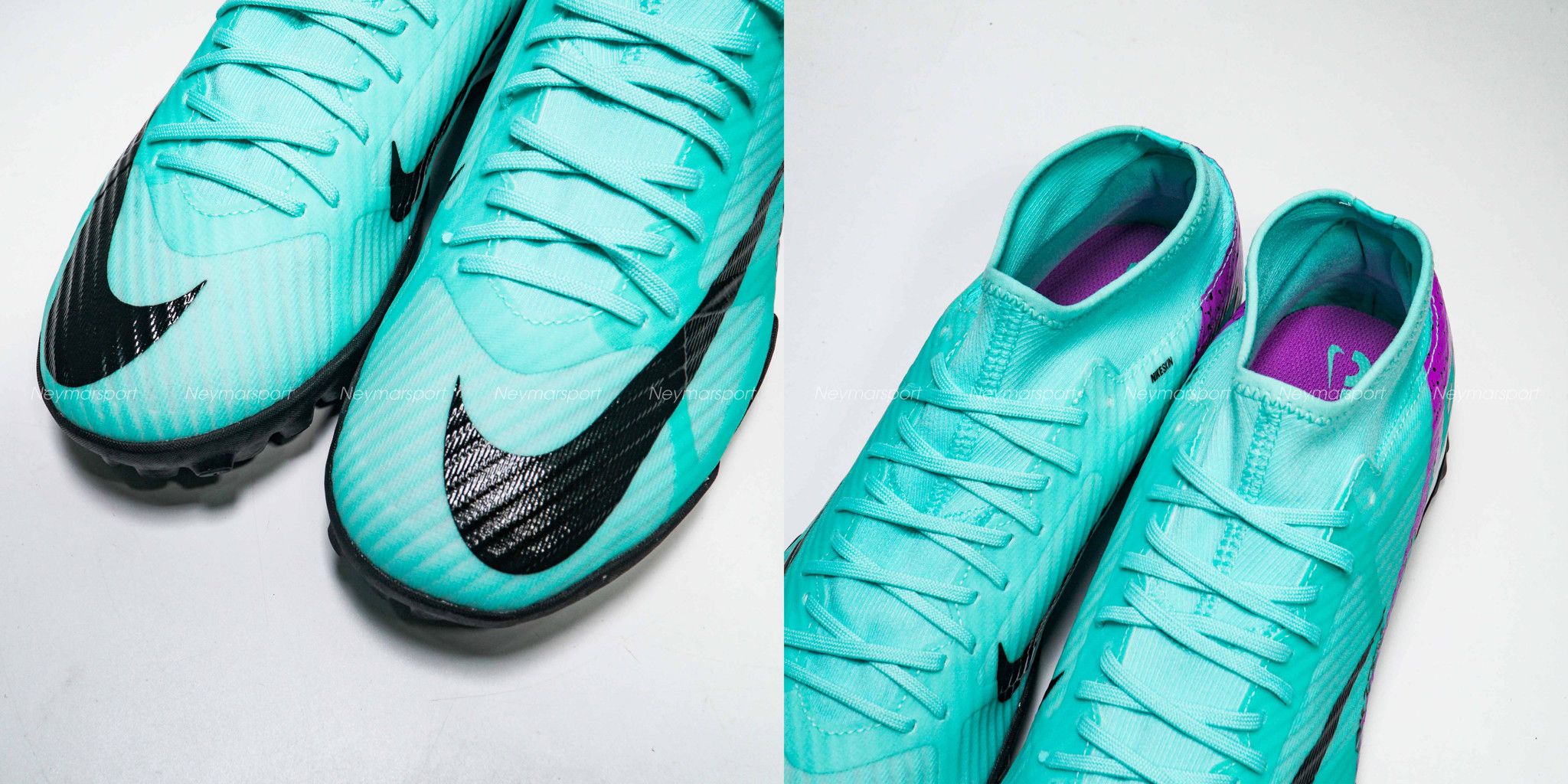 Nike Air Zoom Mercurial Superfly 9 Academy TF Peak Ready - Hyper Turq/Fuchia Dream Black/White là mẫu giày phổ thông phiên bản cổ cao dành cho sân cỏ nhân taọ 5-7 người. Nike Air Zoom Mercurial Superfly 9 Academy TF Peak Ready - Hyper Turq/Fuchia Dream Black/White sở hữu gam màu xanh nổi bật kết hợp cùng biểu tượng Swoosh màu đen, các điểm nhấn màu tím trên thân giày và mặt đế làm nổi bật công nghệ Air Zoom, tạo nên vẻ đẹp độc đáo và cuốn hút, khiến cho đôi giày trở thành tâm điểm chú ý trên sân cỏ.