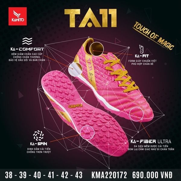 KAMITO TA11 là một trong những mẫu giày đá bóng vô cùng nổi tiếng trong giới bóng đá phong trào, được thiết kế với sự góp ý của cầu thủ Tuấn Anh - Hoàng Anh Gia Lai Việt Nam. Kamito TA11 ra đời để vinh danh cũng như ghi nhận những đóng góp đáng giá của cầu thủ Nguyễn Tuấn Anh. Giống như những mẫu giày "Signature" khác, Kamito TA11 sở hữu những đặc trưng khác biệt và thú vị liên quan đến đội trưởng của CLB Hoàng Anh Gia Lai.