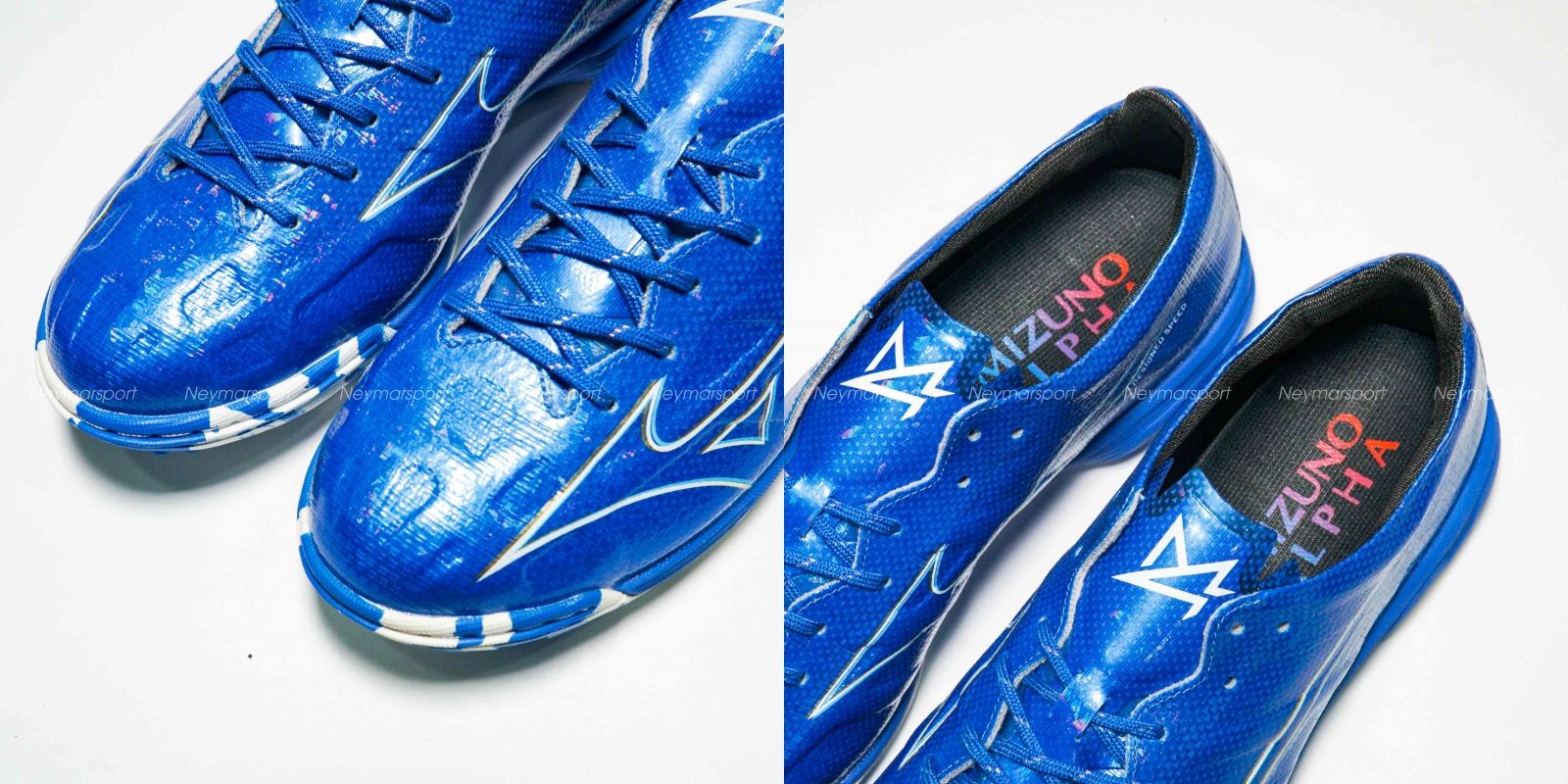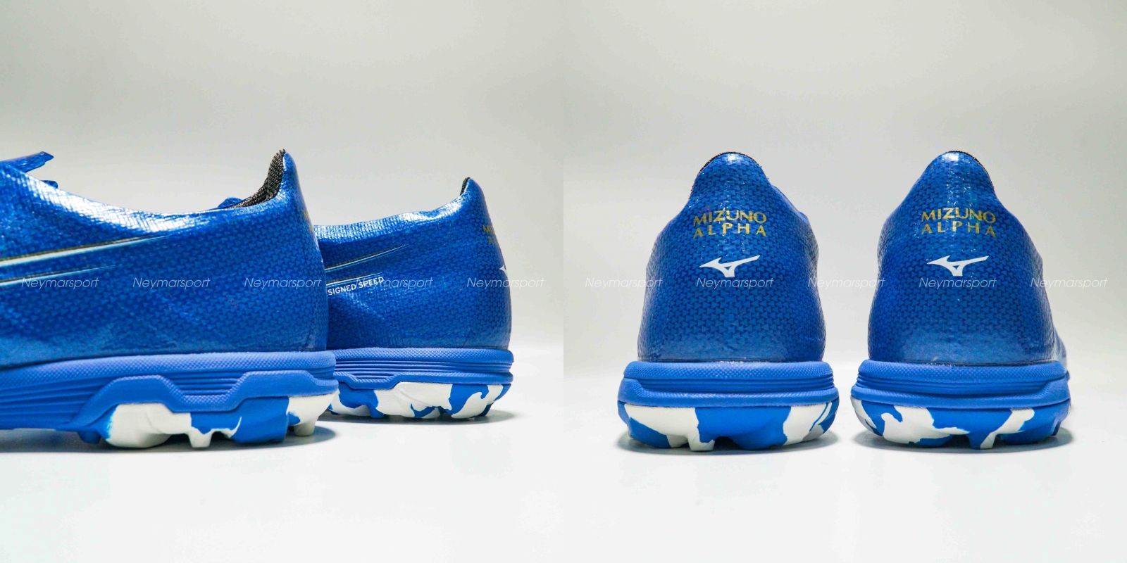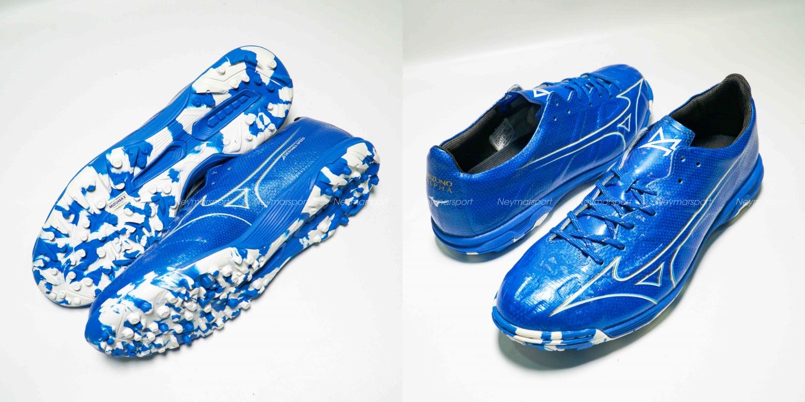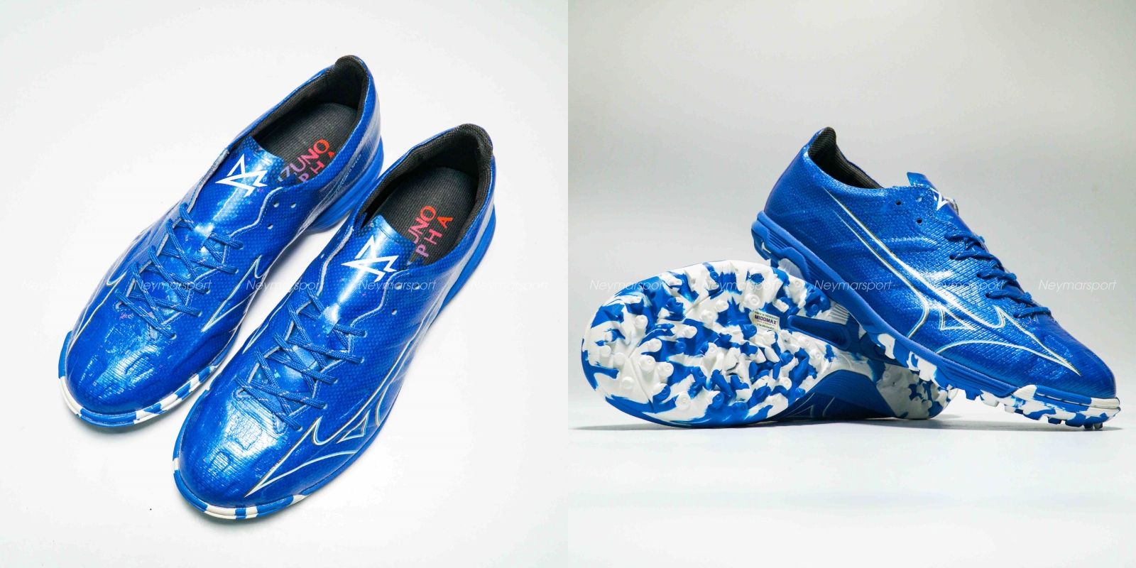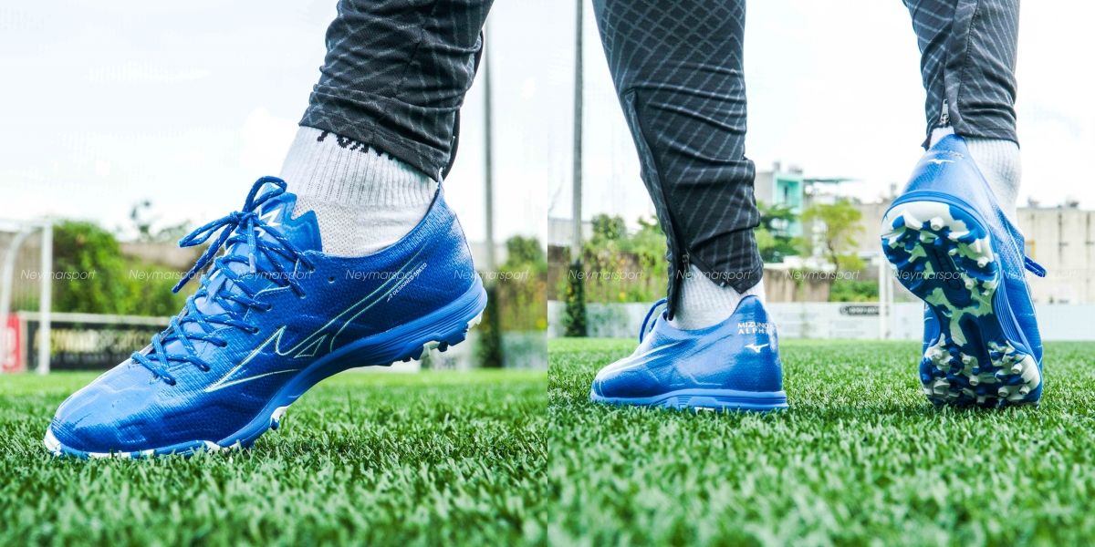Giày đá bóng Mizuno Alpha Elite TF Mugen - Laser Blue/White/Gold P1GD246227 là phiên bản cao cấp dành cho mặt sân cỏ nhân tạo 5-7 người. Điểm nổi bật nhất ở đôi giày này phải kể đến thiết kế đinh dạng núm tròn và cứng cáp. Mẫu giày đá bóng Mizuno Alpha lần này được phối bởi các gam màu Laser Blue/White/Gold. Trên nền màu xanh, logo của Mizuno được làm nổi bật bởi sự kết hợp màu trắng, sau đó sử dụng đồ họa để phổ ra các vệt màu nhạt chạy dần về phía gót giày. Thiết kế độc đáo này mang đến cảm giác tốc độ sẵn sàng bùng nổ trong những đường chạy bóng bứt phá.