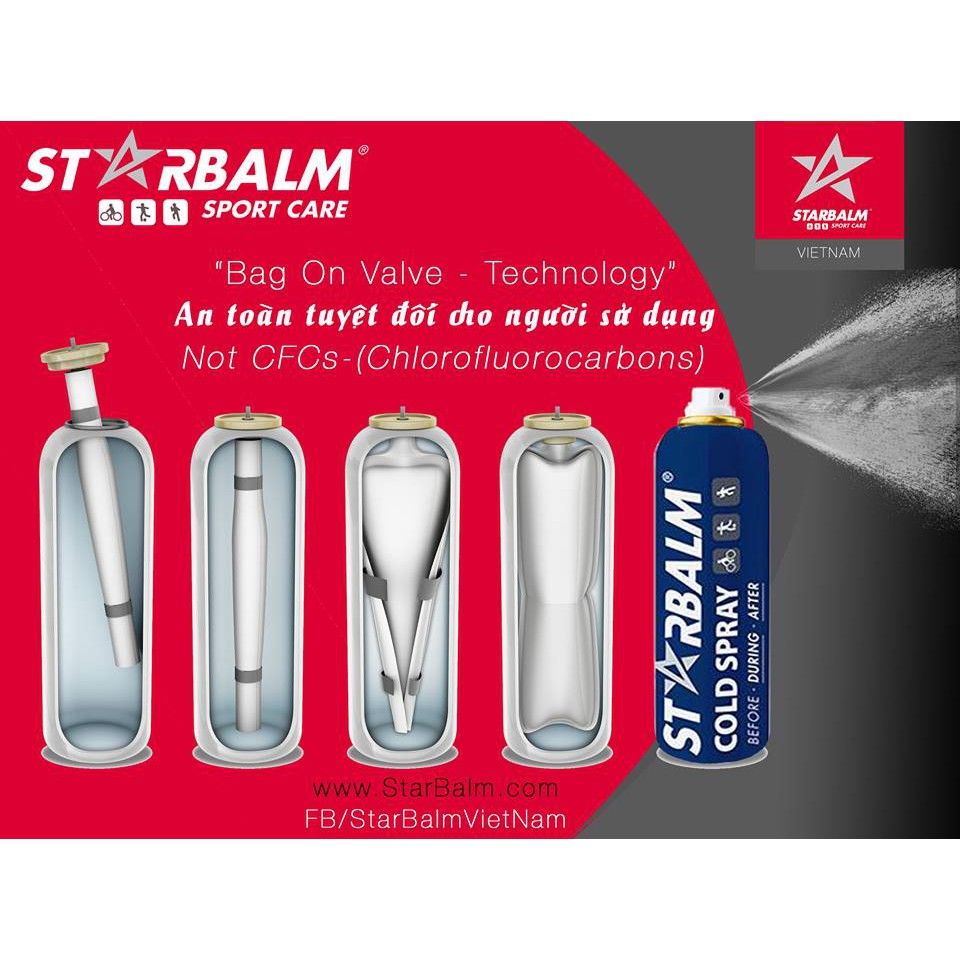 Công nghệ xịt Bag on Valve – duy nhất ở chai xịt STARBALM – xịt đến giọt cuối cùng: Chai xịt áp dụng công nghệ nén khí toàn phần - giúp bạn sử dụng sản phẩm ở mọi tư thế, góc khó và dễ dàng thực hiện như bạn chụp selfie vậy. Một giọt cũng không xót - Bạn sẽ dùng triệt để sản phẩm không chừa giọt nào nên không gây lãng phí cho bạn chút nào, xứng đáng với giá tiền bạn bỏ ra mua sản phẩm. Khí nén được sử dụng là không khí sạch được lọc với quy trình khắc khe và nén vào bình bởi áp lực cao nên không chứa các thành phần cháy nổ.