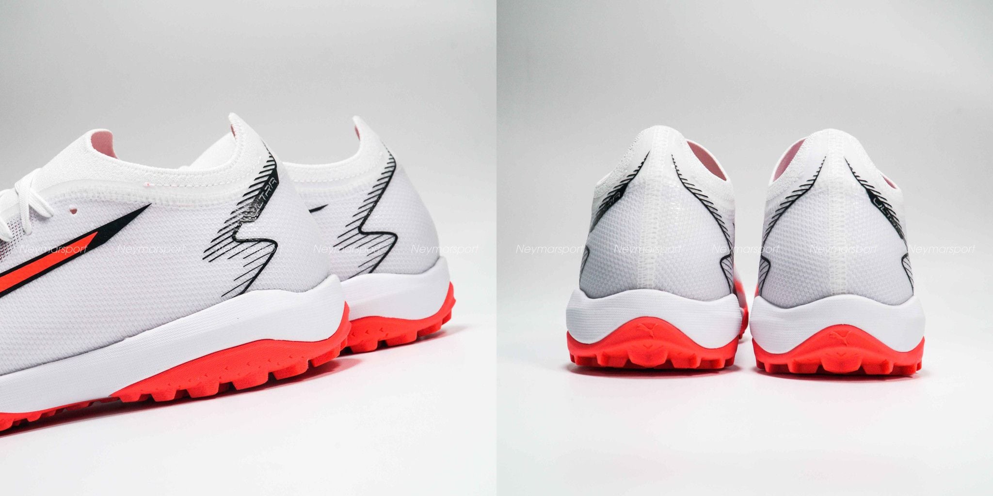 Về ngoại hình, toàn bộ thân PUMA Ultra Match TT Breakthrough - PUMA White/PUMA Black/Fire Orchid sở hữu một gam màu trắng tinh khiết bắt mắt cùng với họa tiết mang tính biểu tượng được sáng tạo hiện đại với những vệt màu đen, cam hài hòa làm điểm nhấn rõ nét. Tất cả họa tiết và màu sắc đồng nhất, hỗ trợ lẫn nhau tạo nên vẻ đẹp táo bạo rất hiếm có trong những thiết kế trước đây của nhà Báo Đức.