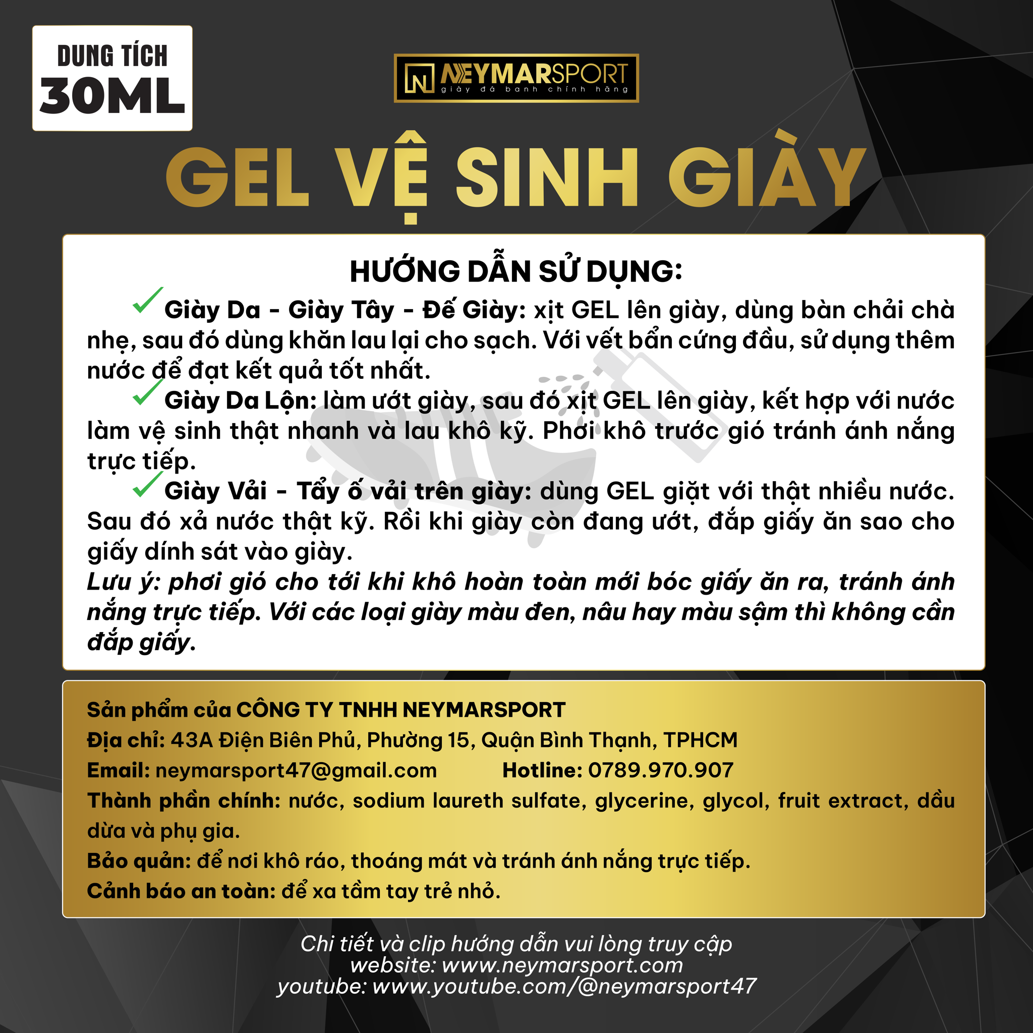 Hướng dẫn sử dụng GEL VỆ SINH GIÀY NEYMARSPORT 30ML: