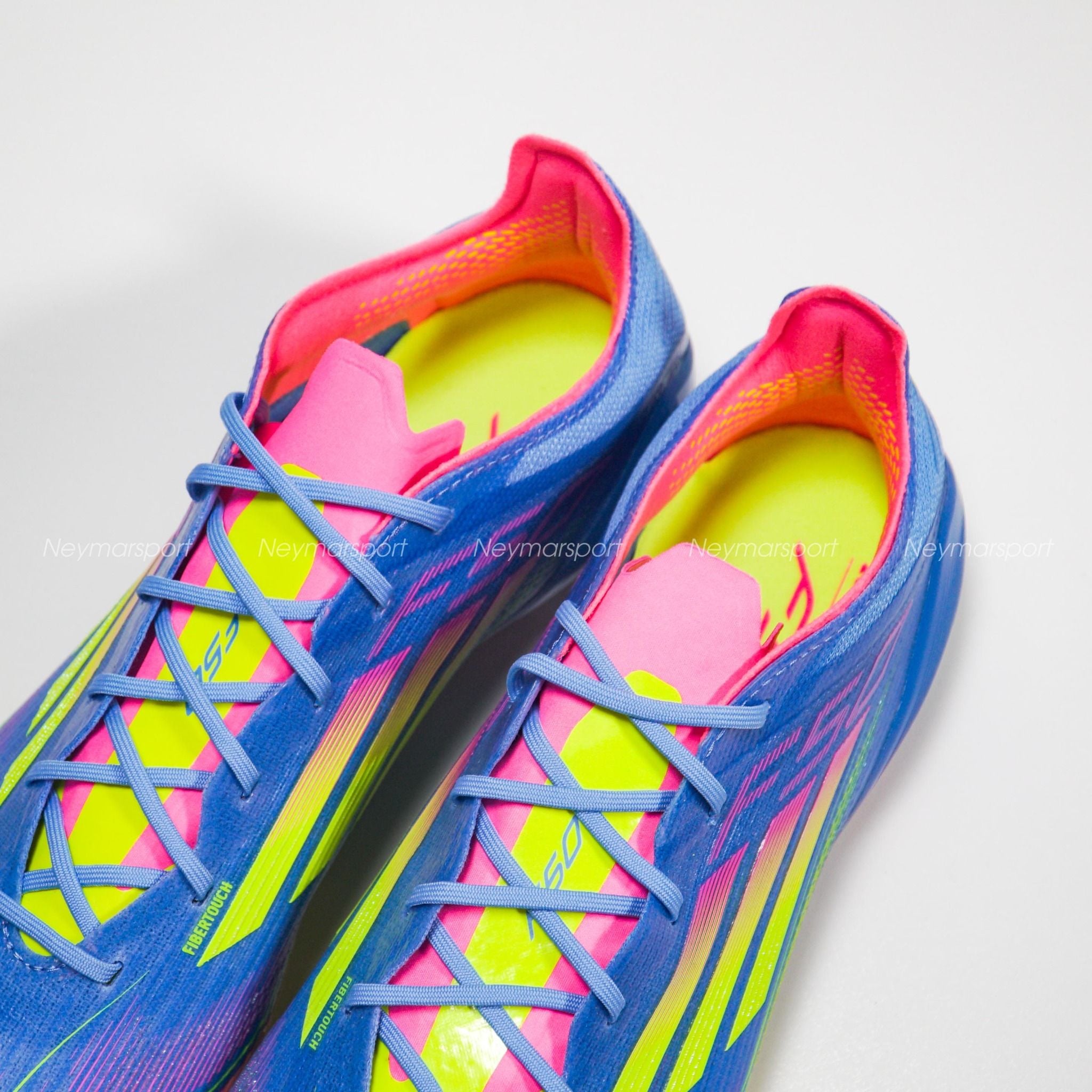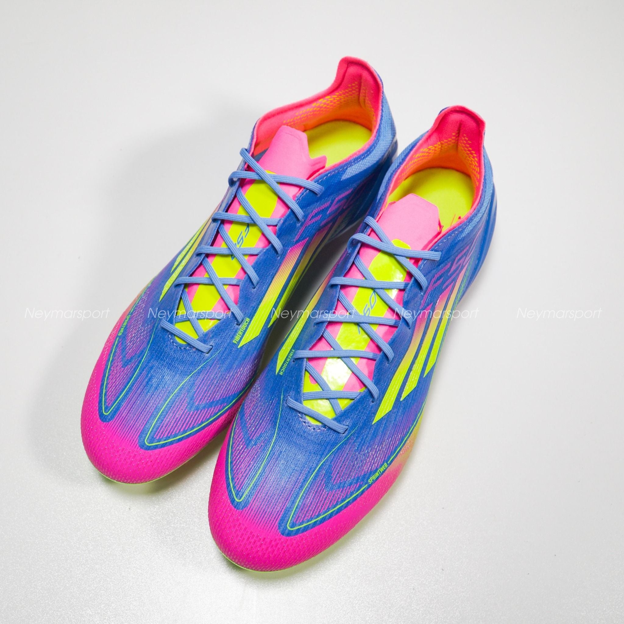 Giày đá bóng adidas F50 Elite FG Celestial Victory - Blue Fusion/Lucid Lemon/Lucid Pink IE1201 là phiên bản cao cấp dành chuyên cho sân cỏ tự nhiên 11 người. Màu hồng rực rỡ chiếm lĩnh phần lưỡi gà và logo F50 ở cả hai bên giày. Ba sọc biểu tượng vẫn giữ đúng họa tiết gradient, pha trộn từ "Lucid Pink" sang "Lucid Yellow". Phần đế giày tiếp tục gây ấn tượng với sắc vàng sáng, kết hợp công nghệ SprintFrame siêu nhẹ, giúp các cầu thủ tăng tốc nhanh chóng và di chuyển linh hoạt trên sân.
