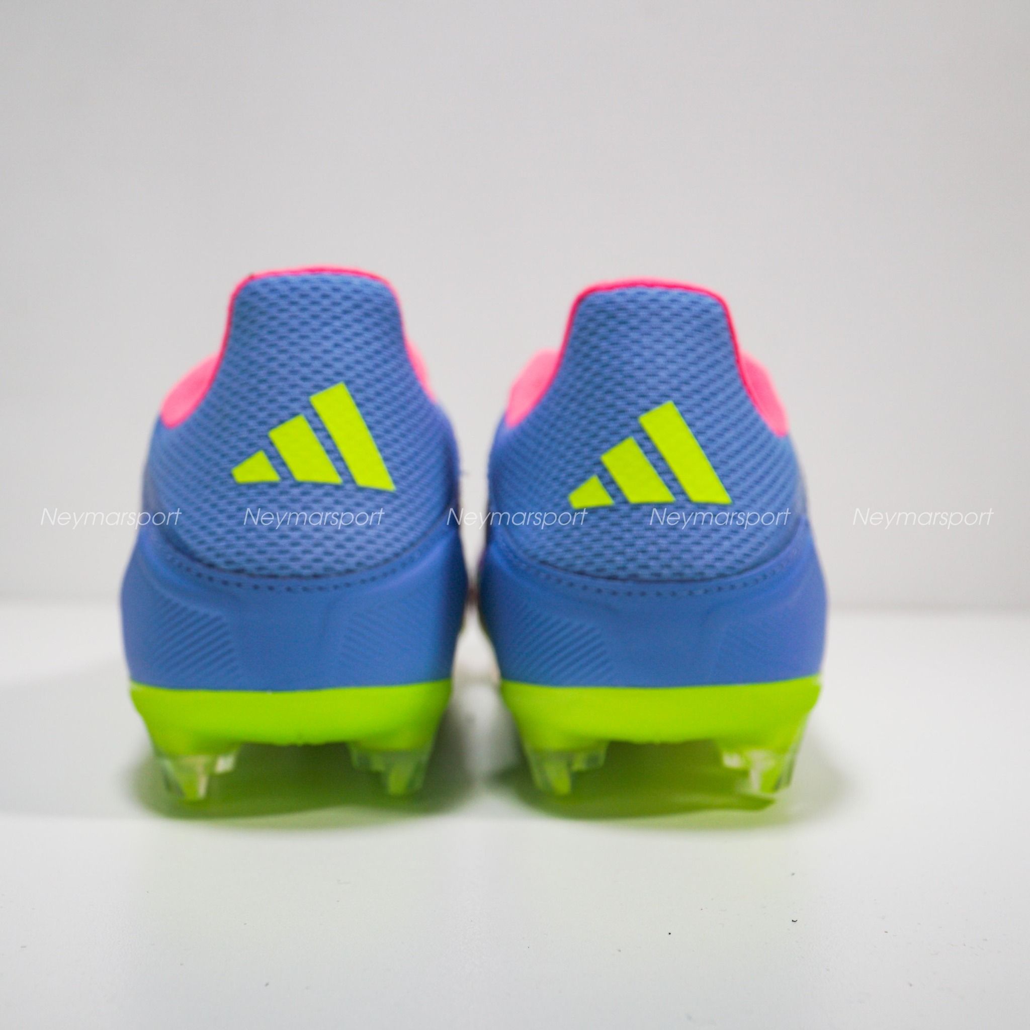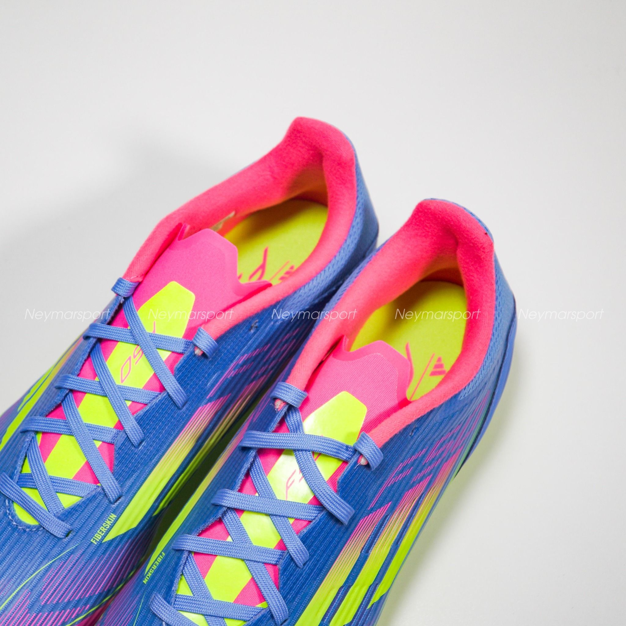 Giày đá bóng adidas F50 League FG/AG Celestial Victory - Blue Fusion/Lucid Lemon/Lucid Pink IE1290 là phiên bản phổ thông dành chuyên cho sân cỏ tự nhiên 11 người. . Màu hồng rực rỡ chiếm lĩnh phần lưỡi gà và logo F50 ở cả hai bên giày. Ba sọc biểu tượng vẫn giữ đúng họa tiết gradient, pha trộn từ "Lucid Pink" sang "Lucid Yellow". Phần đế giày tiếp tục gây ấn tượng với sắc vàng sáng, kết hợp công nghệ SprintFrame siêu nhẹ, giúp các cầu thủ tăng tốc nhanh chóng và di chuyển linh hoạt trên sân.