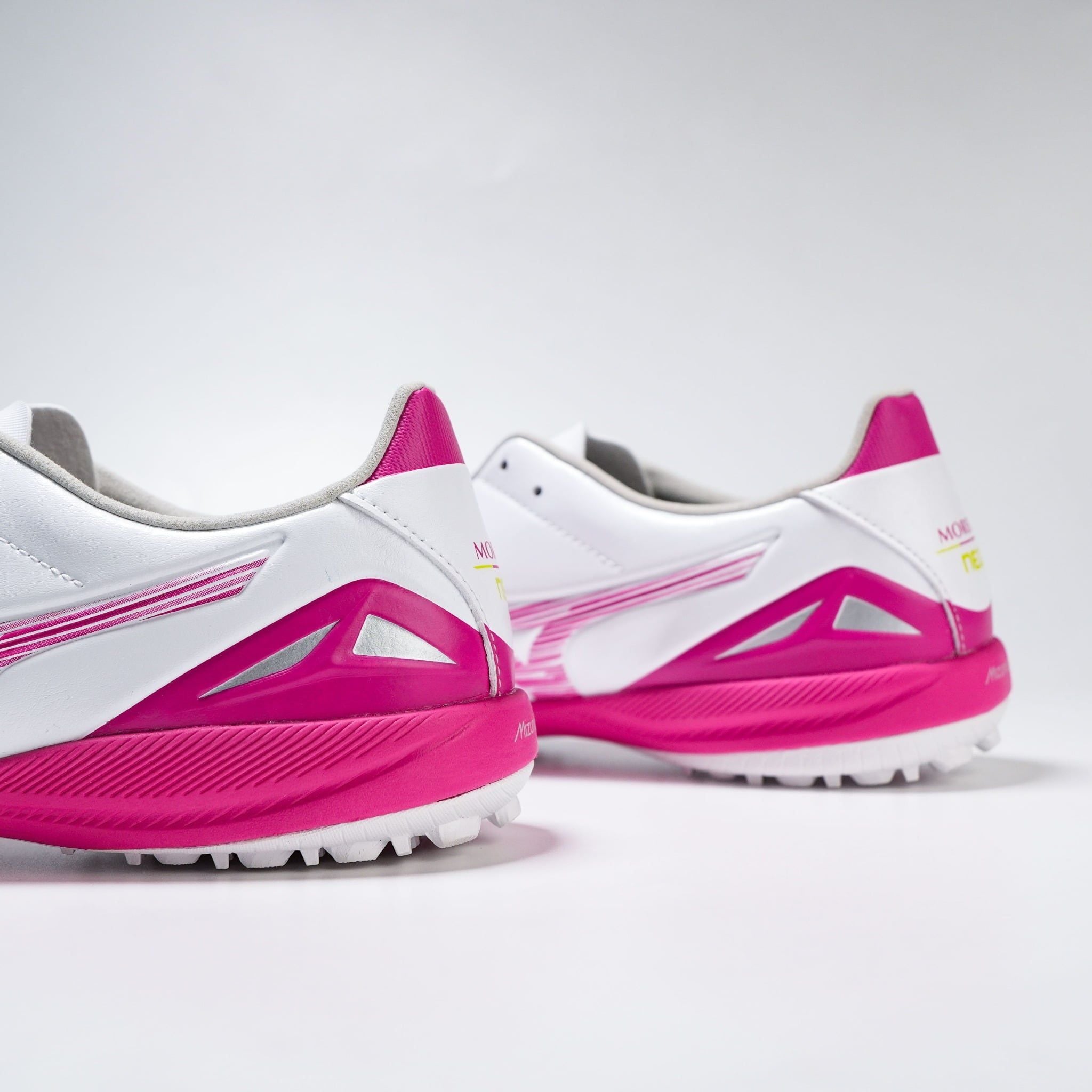 Nằm trong phân khúc cao cấp, mẫu giày đá bóng cỏ nhân tạo Mizuno Morelia Neo IV Pro TF Blazing Flair sở hữu phối màu White/Fuchsia Purple với logo Runbird hồng rực rỡ, mang lại sự tự tin và nổi bật cho người chơi trong mọi trận đấu.