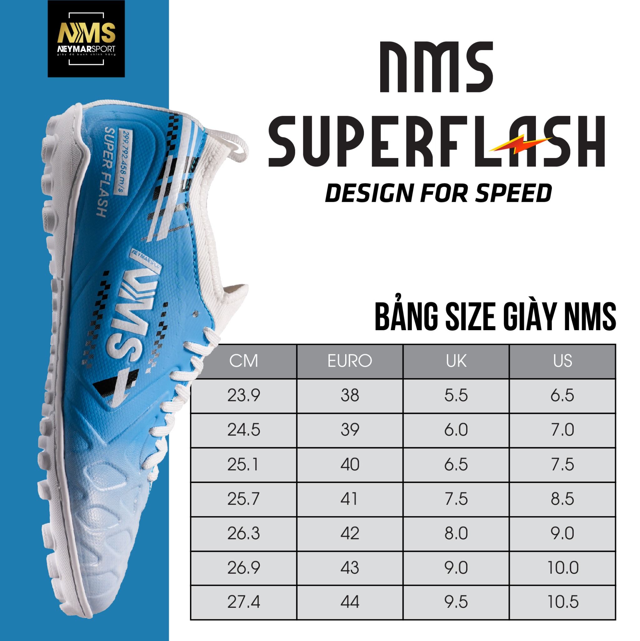 - Bộ đinh độc quyền mới nhất của nhà NMS với dải đinh hình tam giác kết hợp cùng đinh tròn ở những vị trí quan trọng giúp cầu thủ di chuyển linh hoạt, bứt tốc dễ dàng. Khuôn đế được thiết kế với logo NMS ở vị trí trung tâm mang lại điểm nhấn nổi bật cho đôi giày.