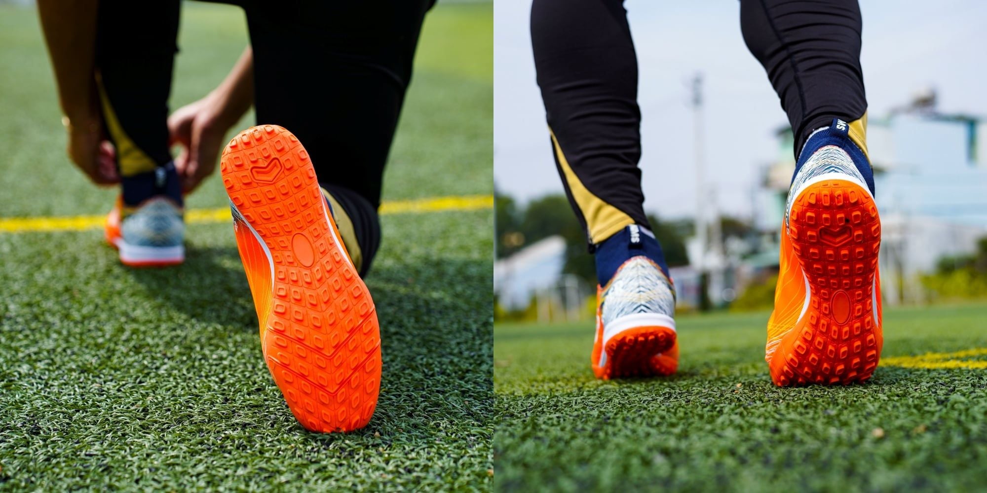 Hệ thống giảm chấn kép: Được trang bị bộ đệm EVA ở cả đế giữa và lót giày, giúp tăng gấp đôi độ đàn hồi. Điều này giúp bảo vệ tối đa khớp gối và gót chân của anh em khi thi đấu trên bề mặt sân cỏ nhân tạo.