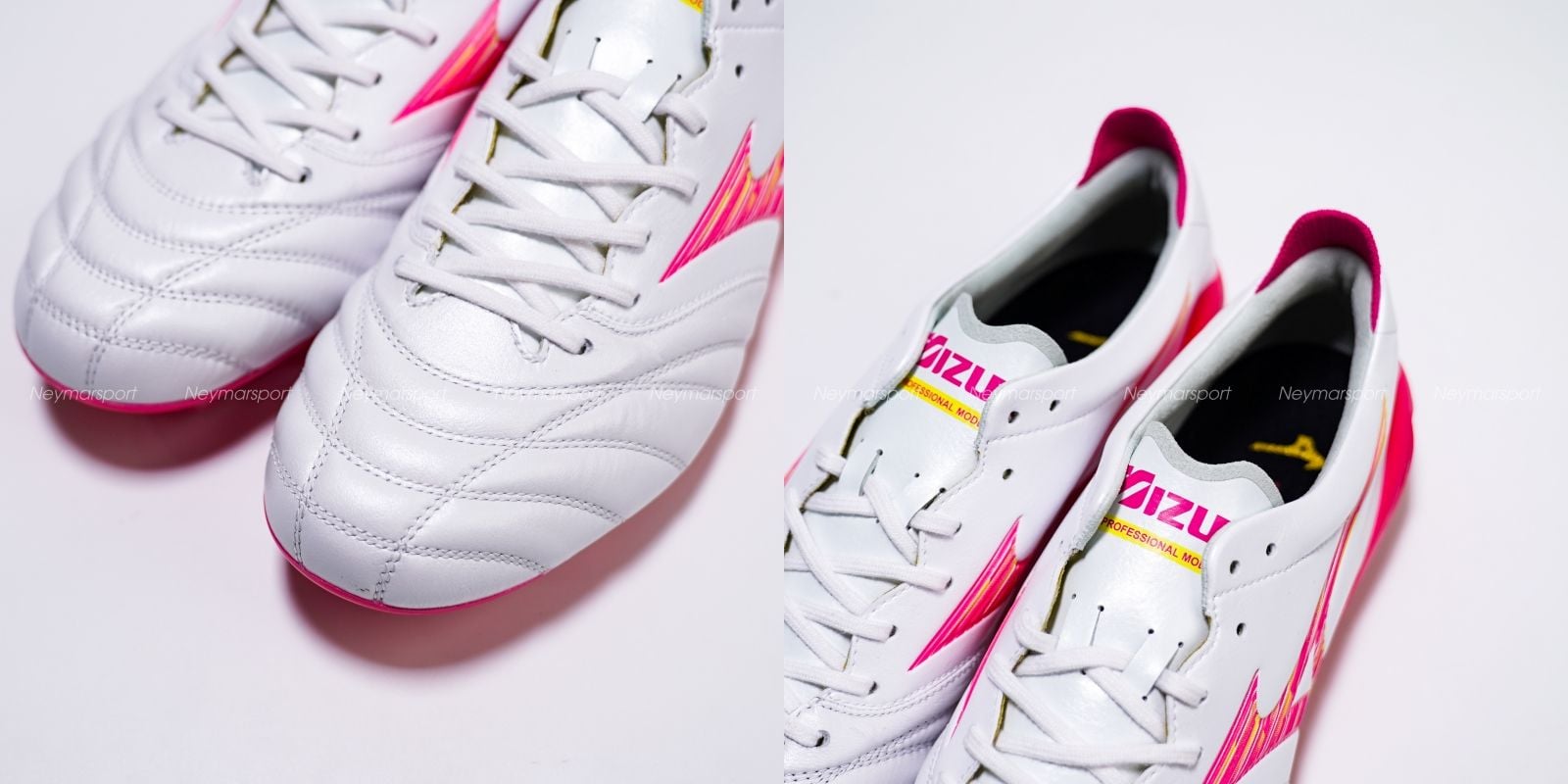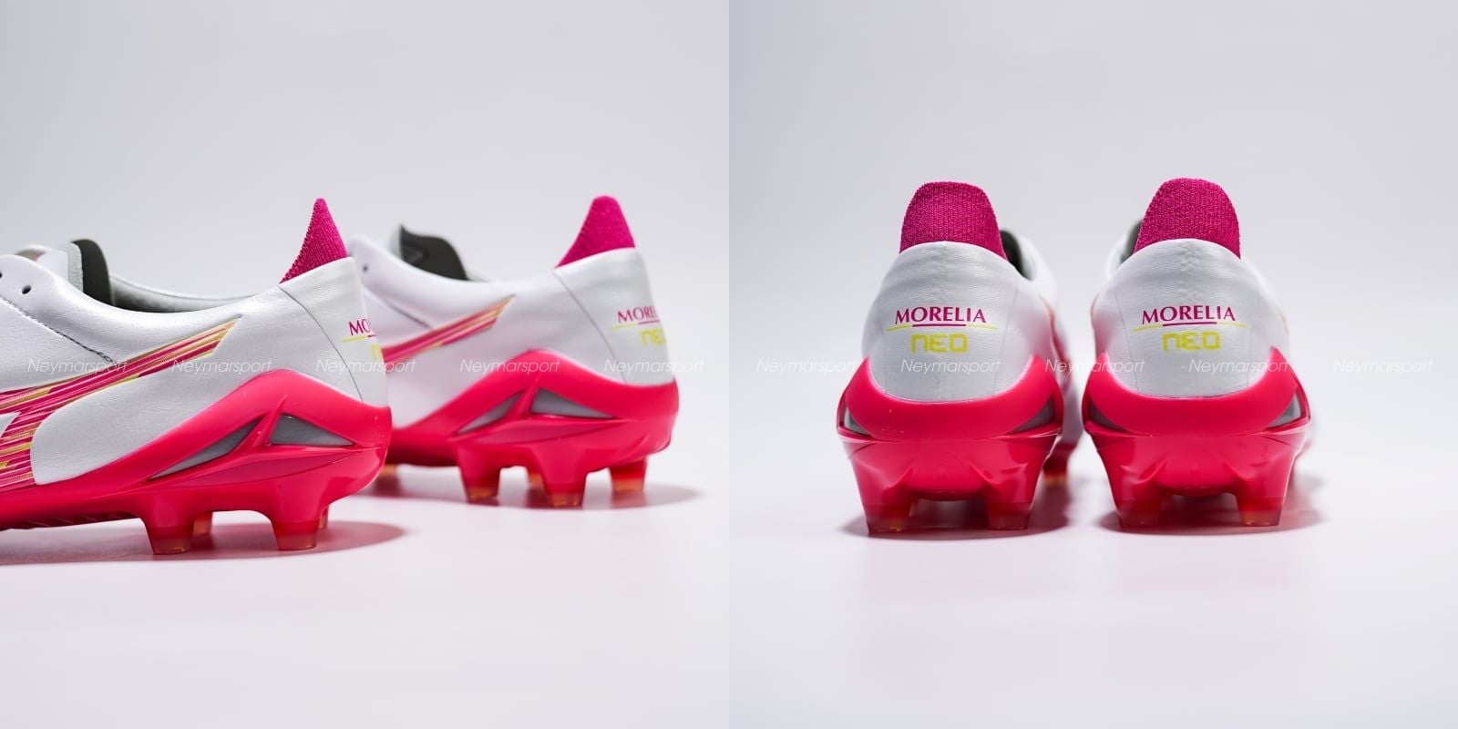 Nằm trong phân khúc cao cấp, mẫu giày đá bóng cỏ tự nhiên Mizuno Morelia Neo IV Elite FG Blazing Flair sở hữu phối màu White/Fuchsia Purple với logo Runbird hồng rực rỡ, mang lại sự tự tin và nổi bật cho người chơi trong mọi trận đấu.