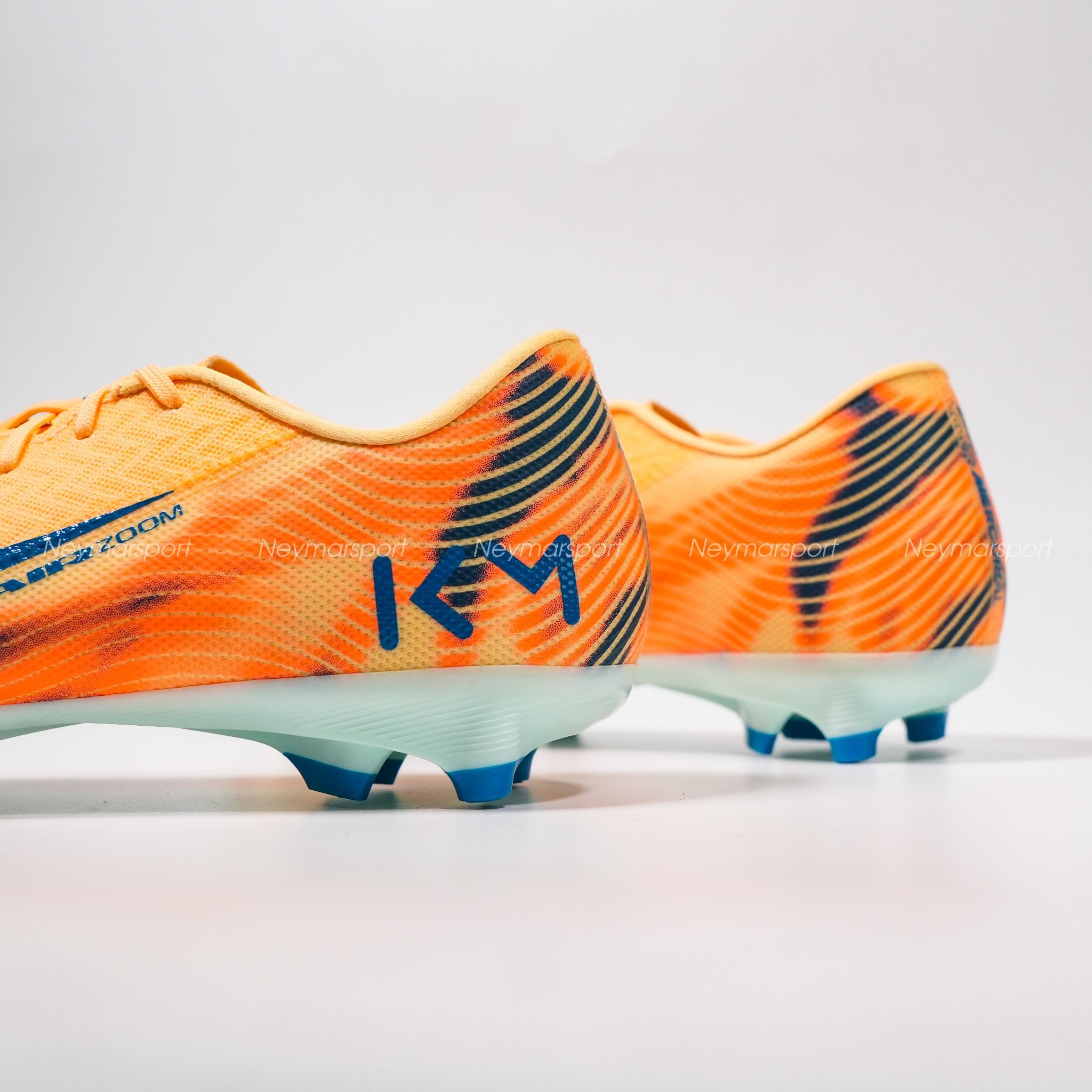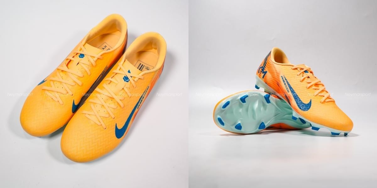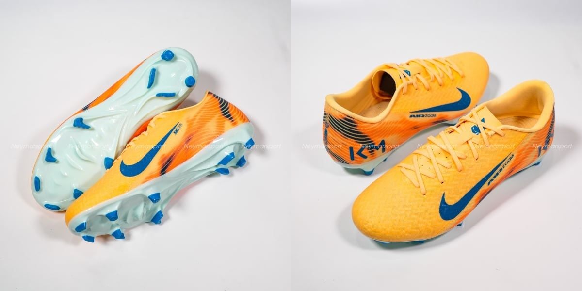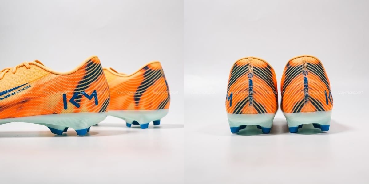 Giày đá bóng Nike Mercurial Mbappé 25-26 sở hữu màu chủ đạo "Melon Tint". Một gam cam đào nhẹ nhàng tạo nên sự nổi bật trên sân. Đế giày màu "Igloo" (xanh nhạt) tạo hiệu ứng tương phản và mang lại cảm giác mát mẻ, sảng khoái. Logo Swoosh màu "Neo Turquoise" (xanh ngọc) được phối hợp đồng bộ với đầu đinh và logo "KM" đặc trưng ở gót giày.
