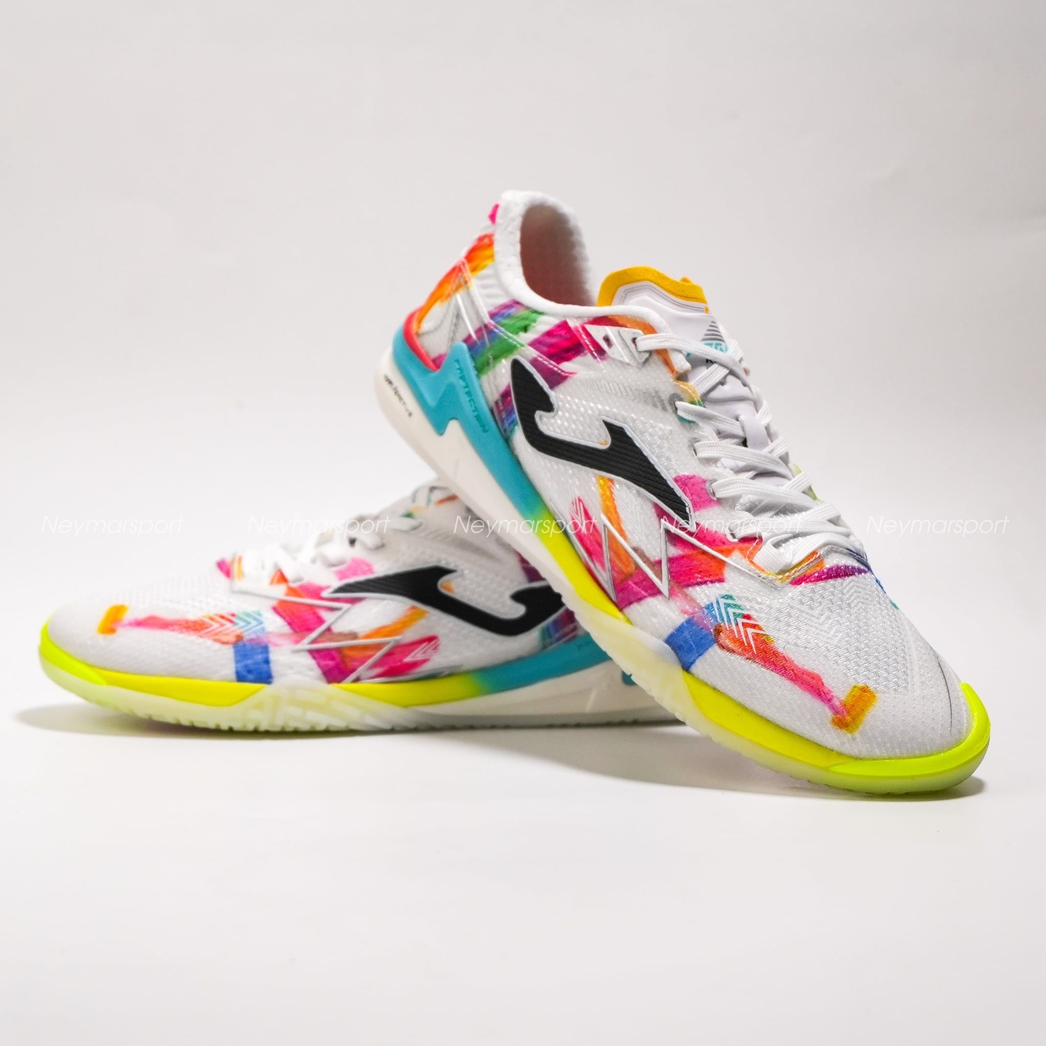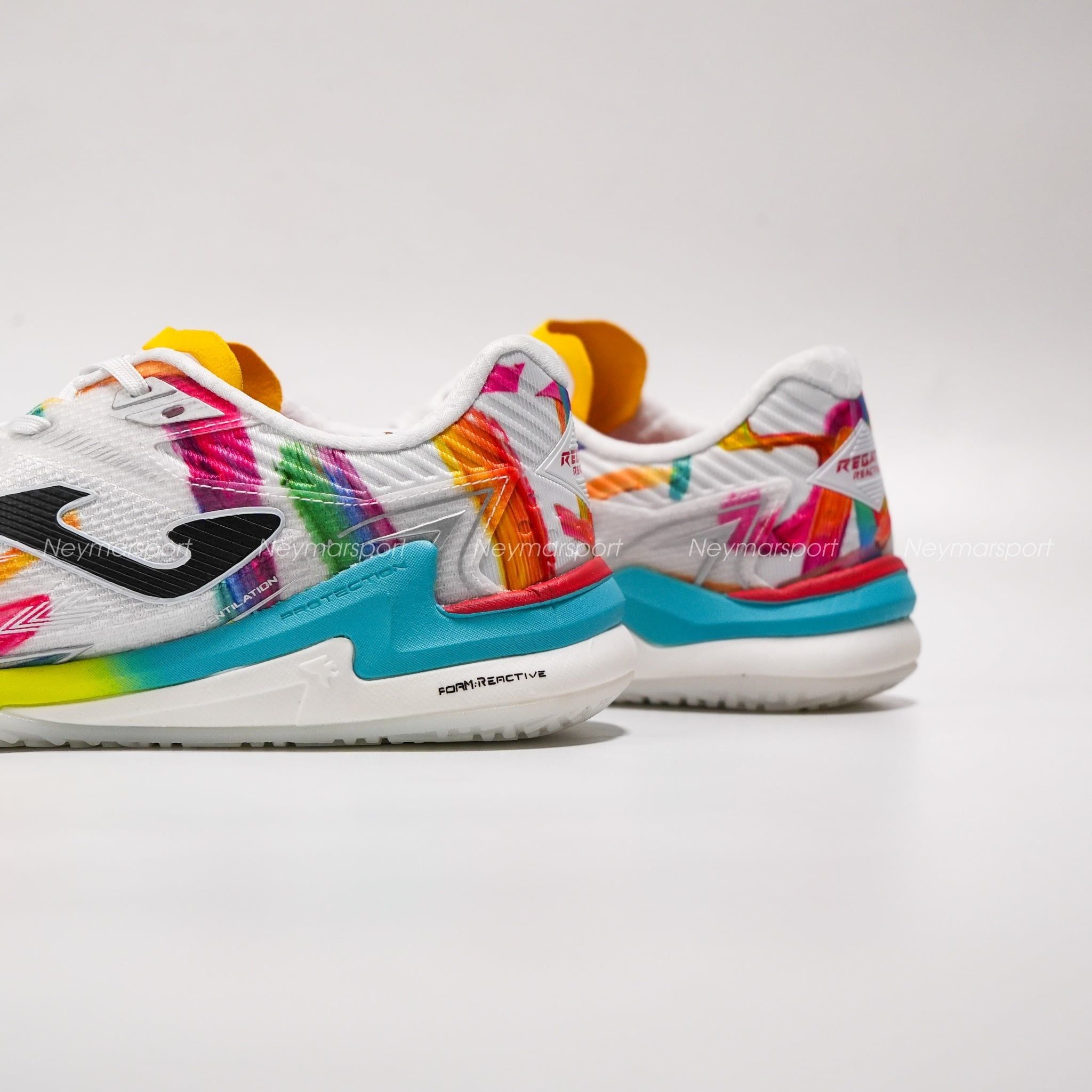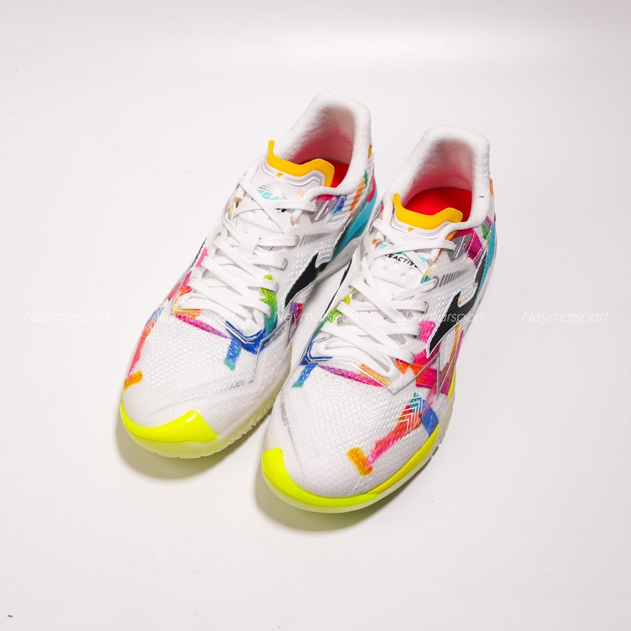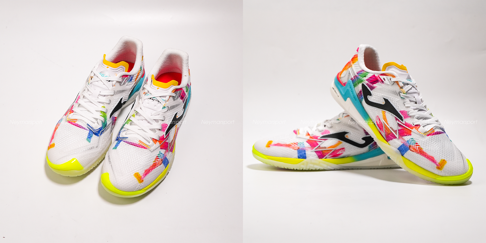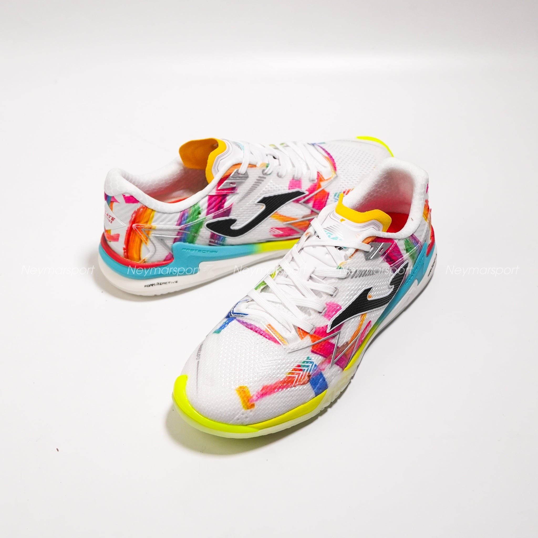Nằm trong phân khúc cao cấp, Joma Regate Reactive We are Futsal nổi bật với phối màu trắng chủ đạo cùng các họa tiết đa sắc, mang lại diện mạo năng động mỗi khi ra sân.