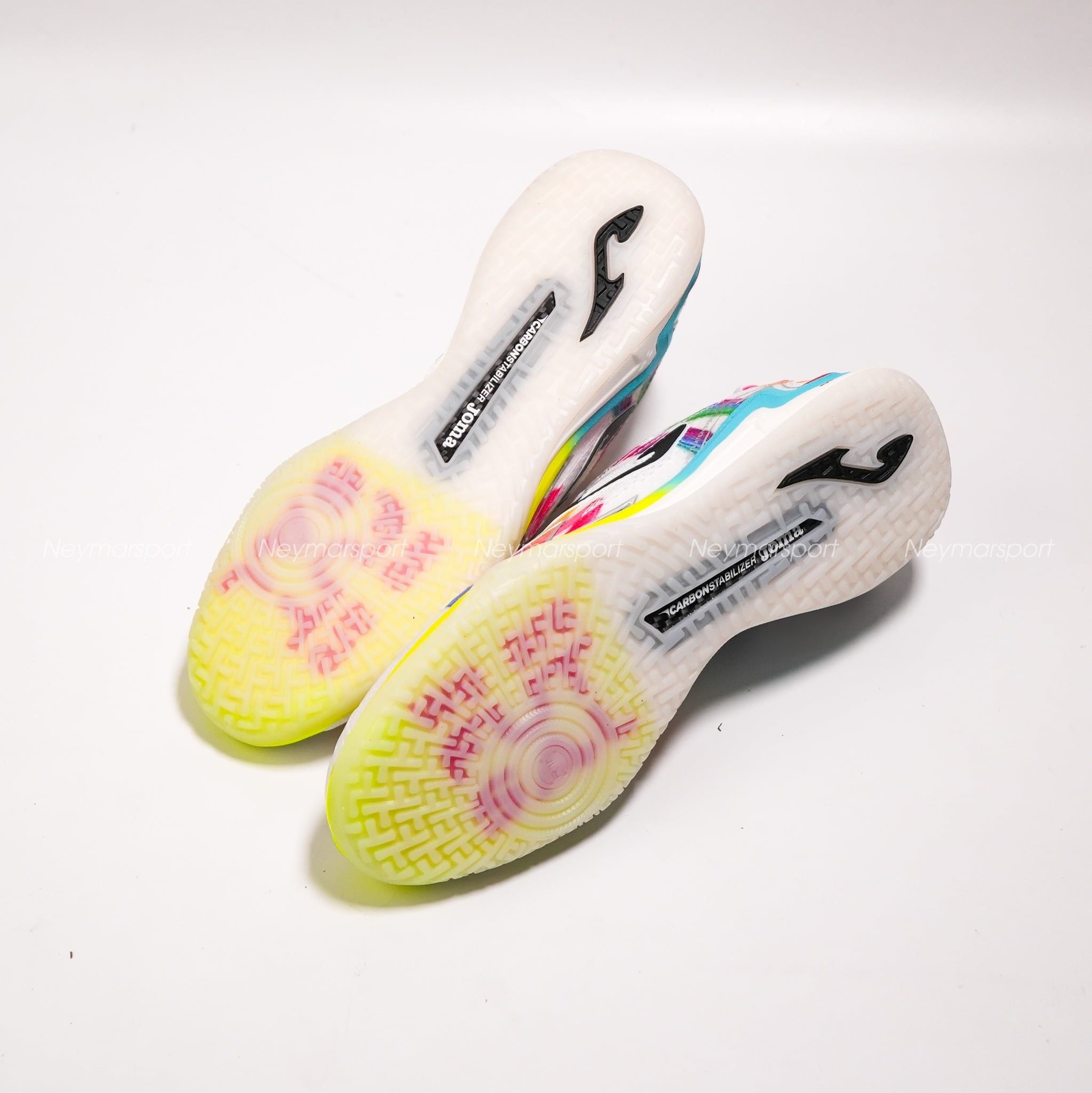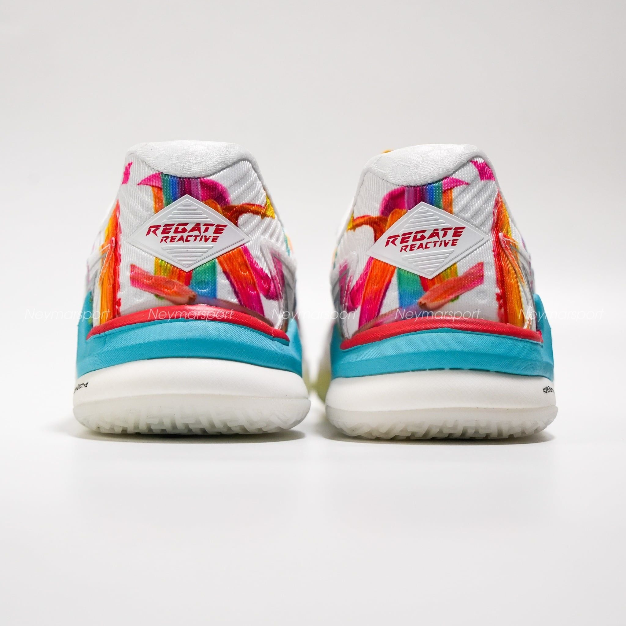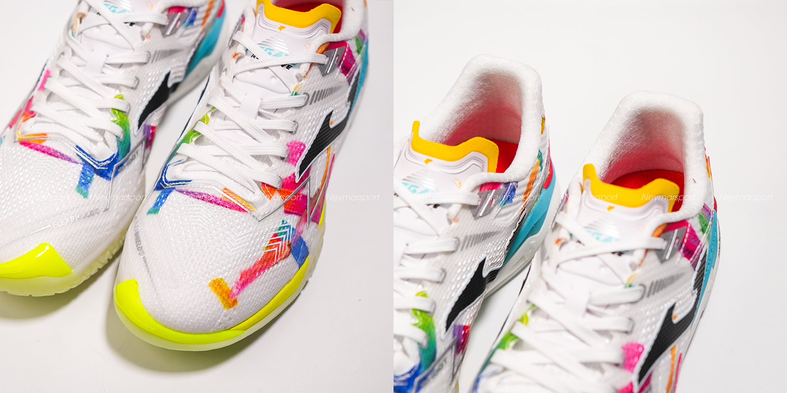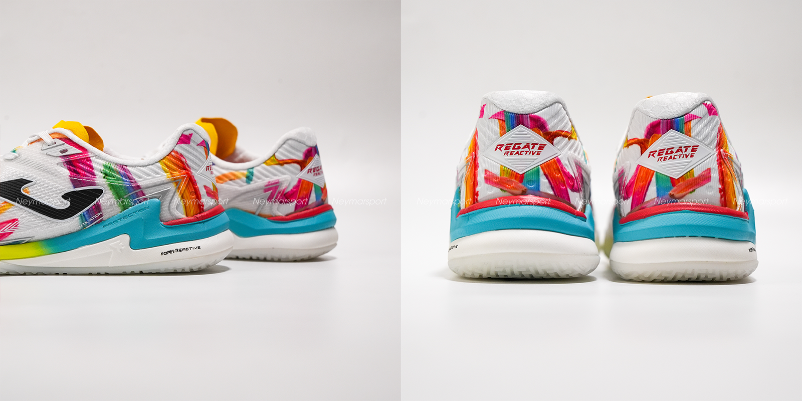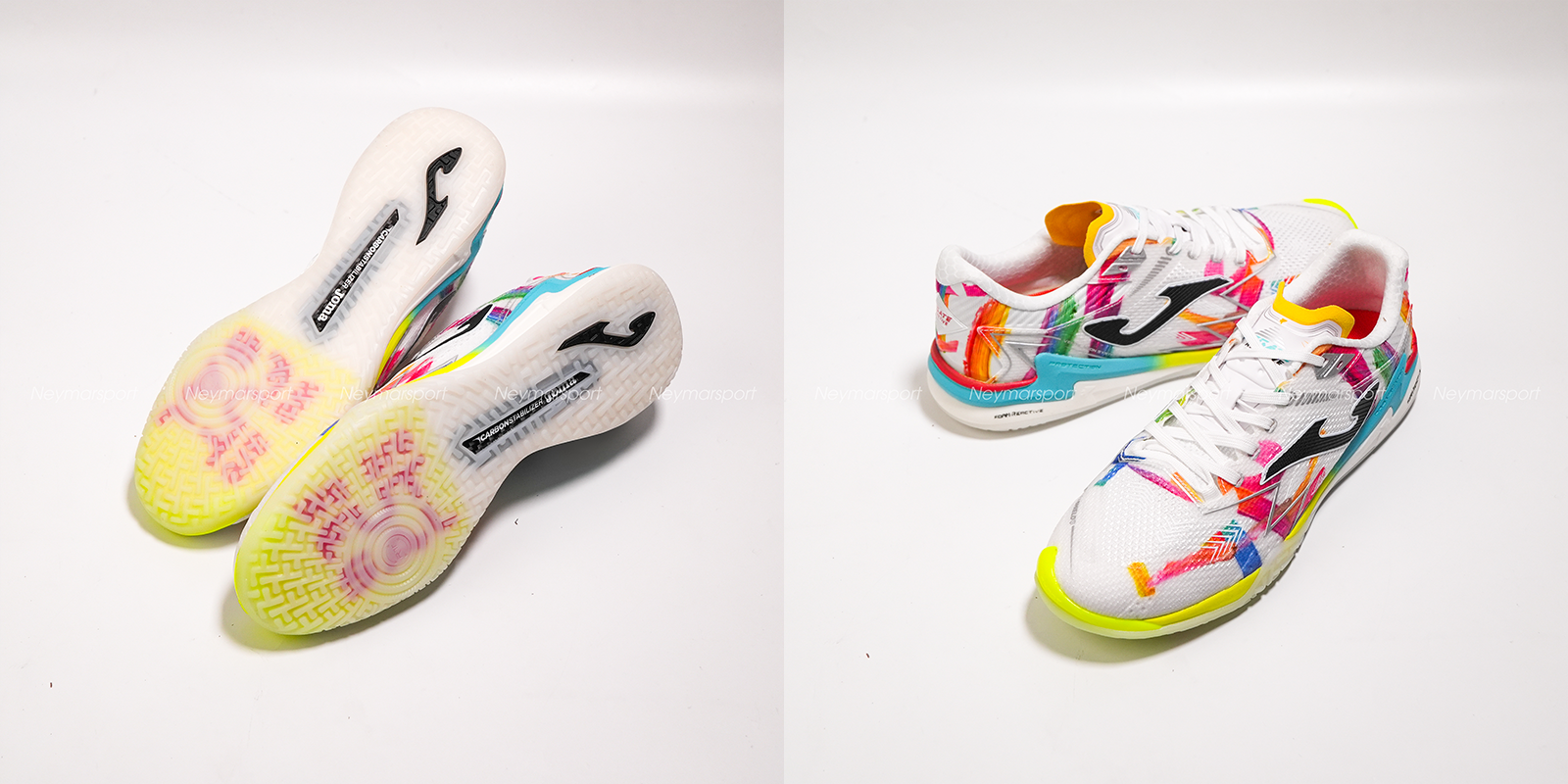 Nằm trong phân khúc cao cấp, Joma Regate Reactive We are Futsal nổi bật với phối màu trắng chủ đạo cùng các họa tiết đa sắc, mang lại diện mạo năng động mỗi khi ra sân.