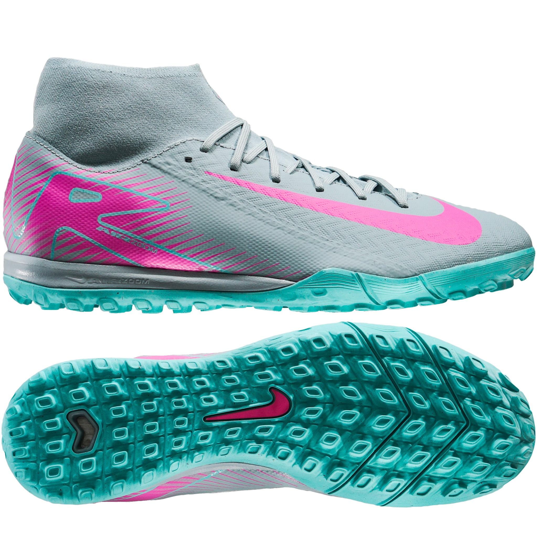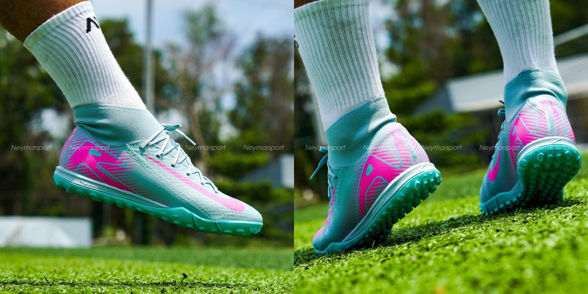 Giày đá bóng Nike Air Zoom Mercurial Superfly 10 Academy TF Prism - Ocean Cube/Pink Blast FQ8331-301 là mẫu giày phổ thông cổ cao dành cho sân cỏ nhân taọ 5-7 người. Dòng Mercurial , biểu tượng của tốc độ, trong lần ra mắt này được bao phủ bởi sắc xanh biển nhạt "Ocean Cube/Pink Blast" tươi mát, mẹo liên tưởng đến đại dương bao la và sức mạnh tiềm ẩn bên trong.