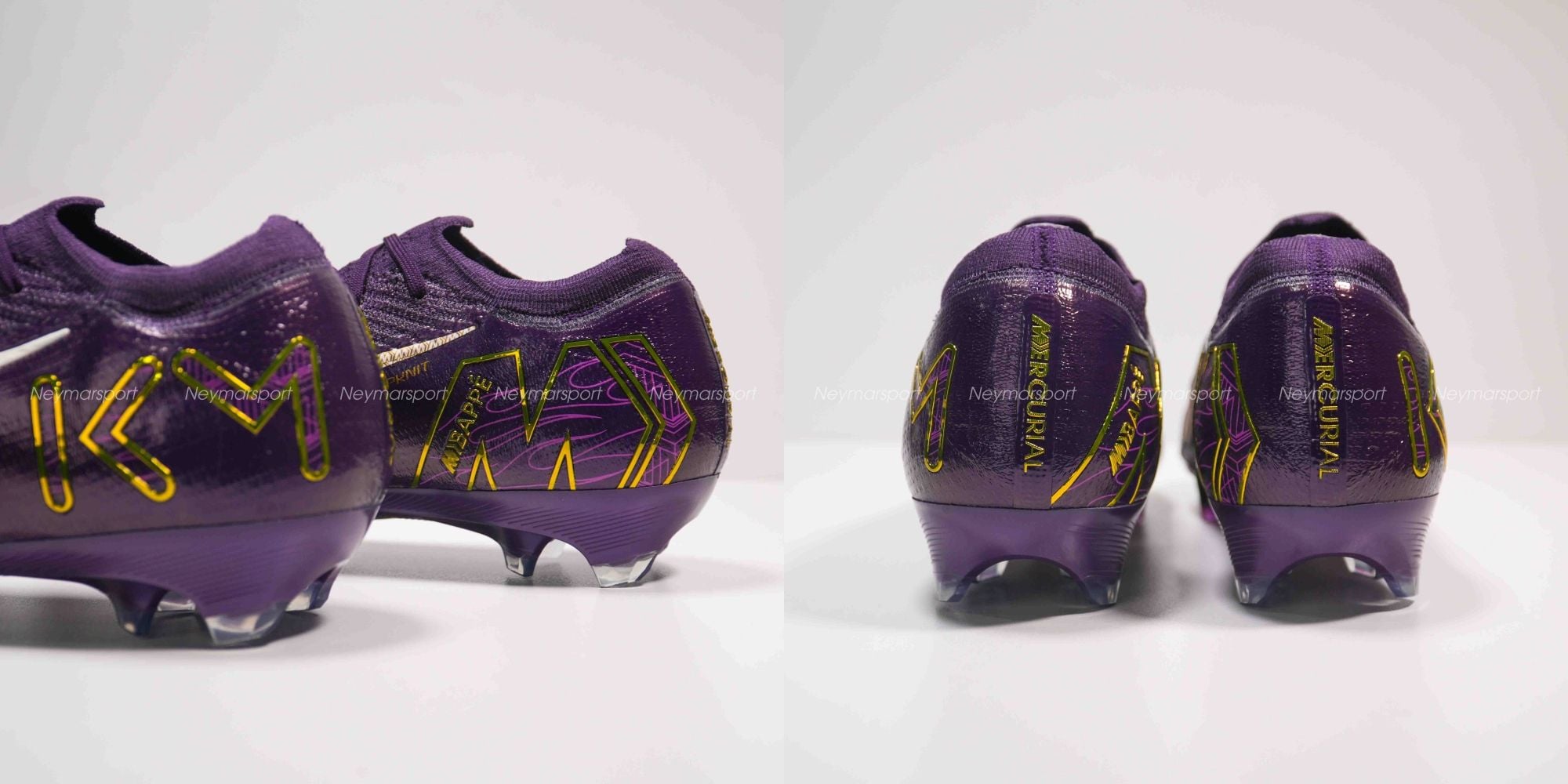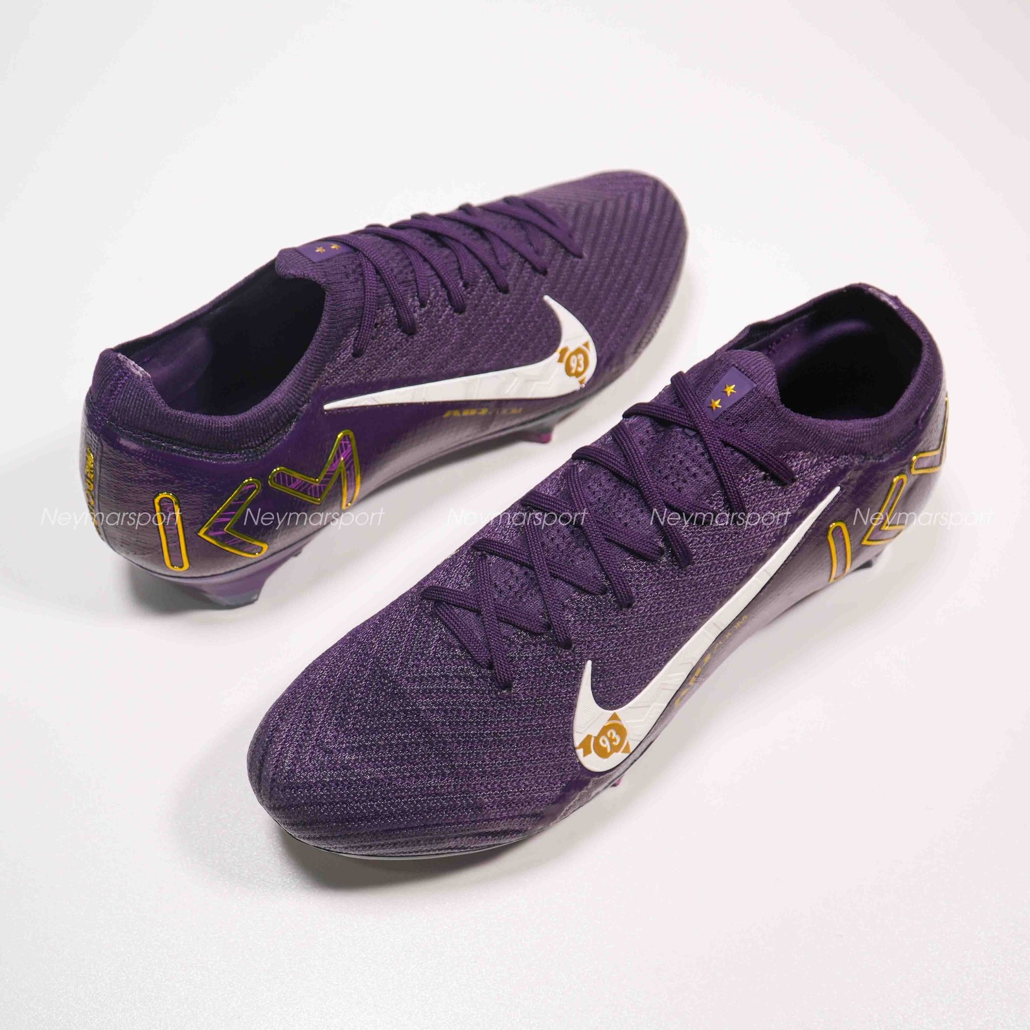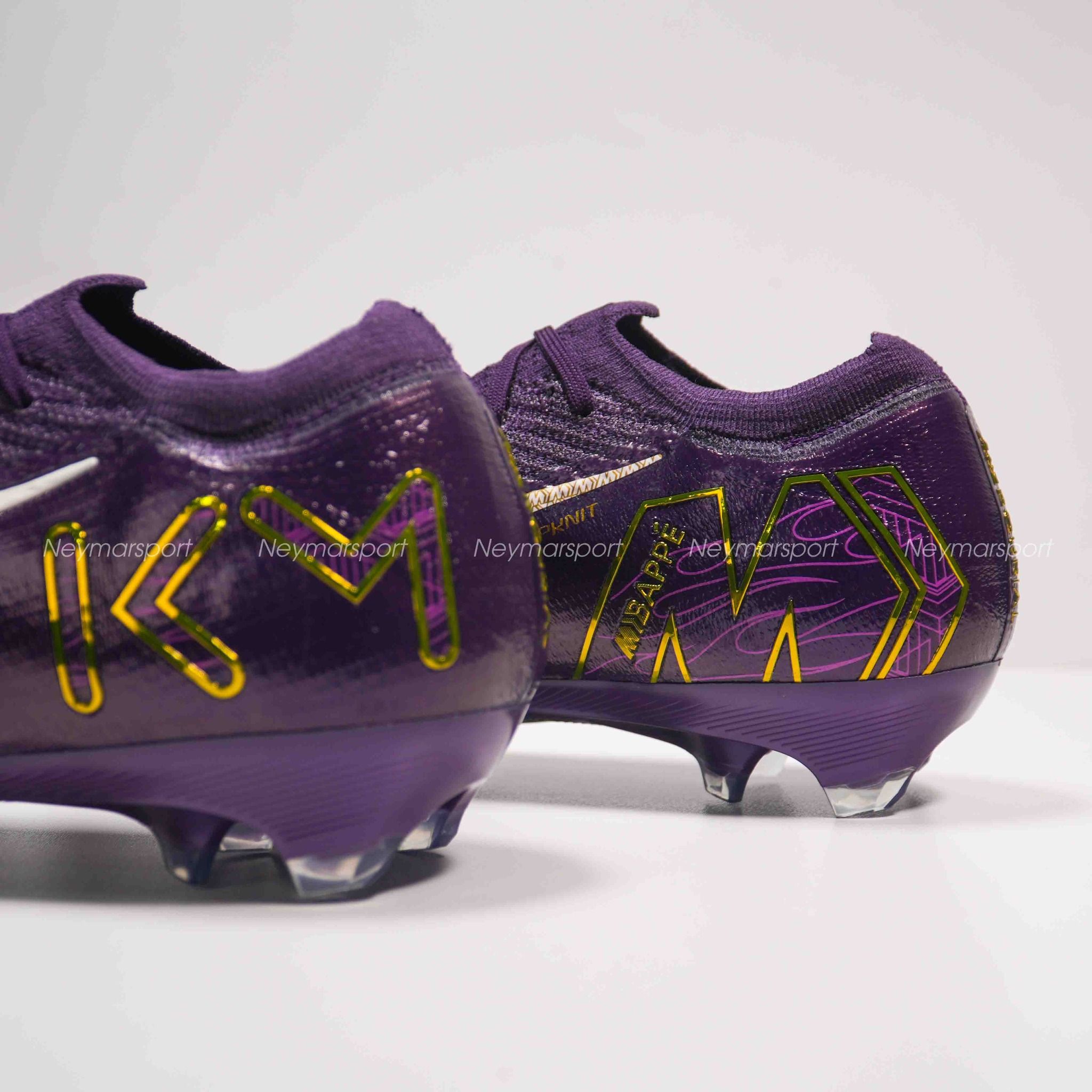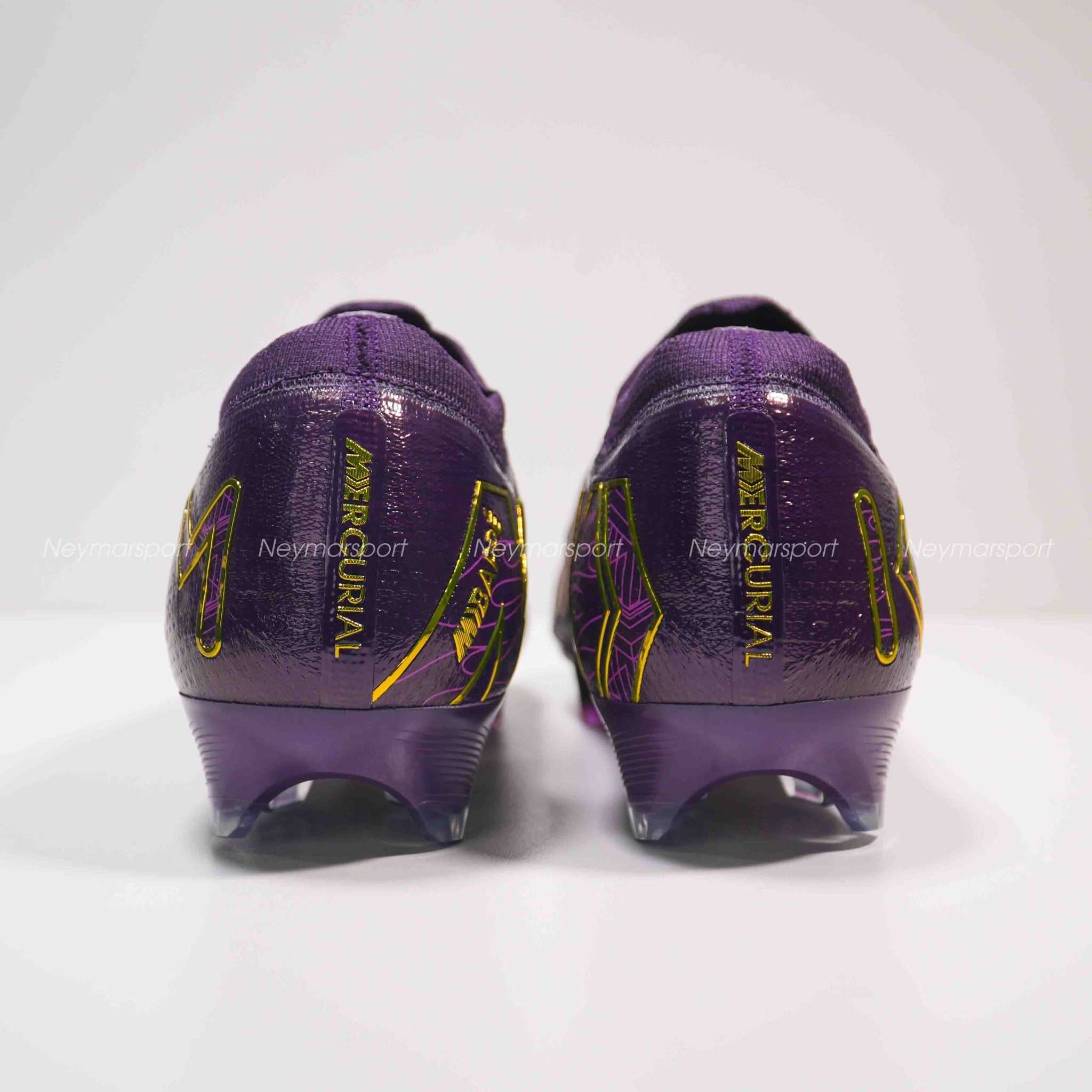 Phiên bản Mercurial Superfly/Vapor Mbappé khoác lên mình sắc tím "Grand Purple" sang trọng, kết hợp cùng màu kem "Pale Ivory" nhẹ nhàng ở phần đế giày và các chi tiết nhỏ. Lót giày bên trong được thiết kế tỉ mỉ với logo Mbappé cách điệu và hình ảnh những ngôi sao lấp lánh. Chúng tượng trưng cho tiềm năng vô hạn và khát vọng chinh phục đỉnh cao. Sự kết hợp màu sắc này toát lên vẻ ngoài vừa mạnh mẽ, vừa tinh tế, phù hợp với phong cách của Mbappé. Các chi tiết viền vàng kim loại góp phần tăng thêm vẻ sang trọng và đẳng cấp.
