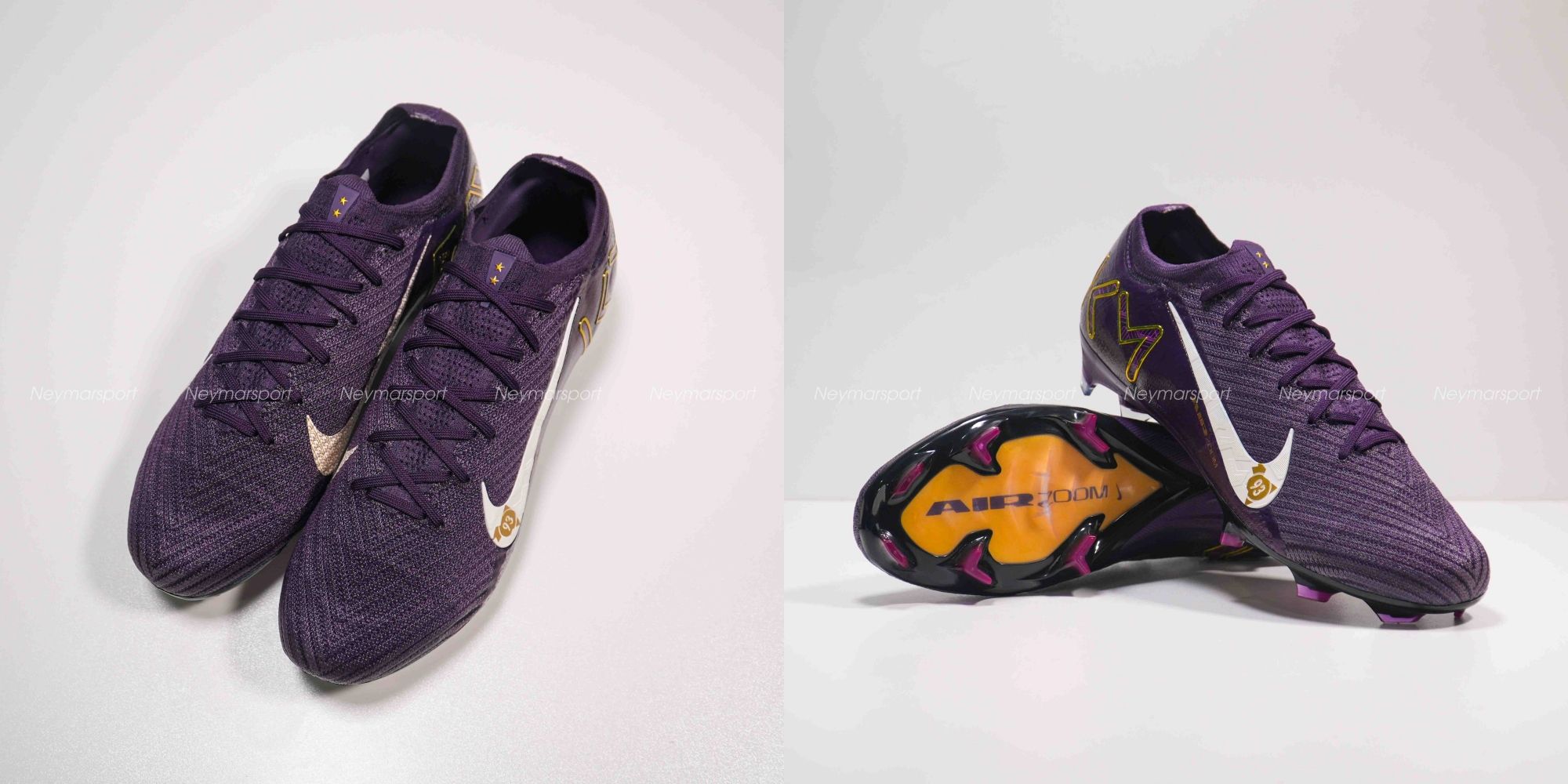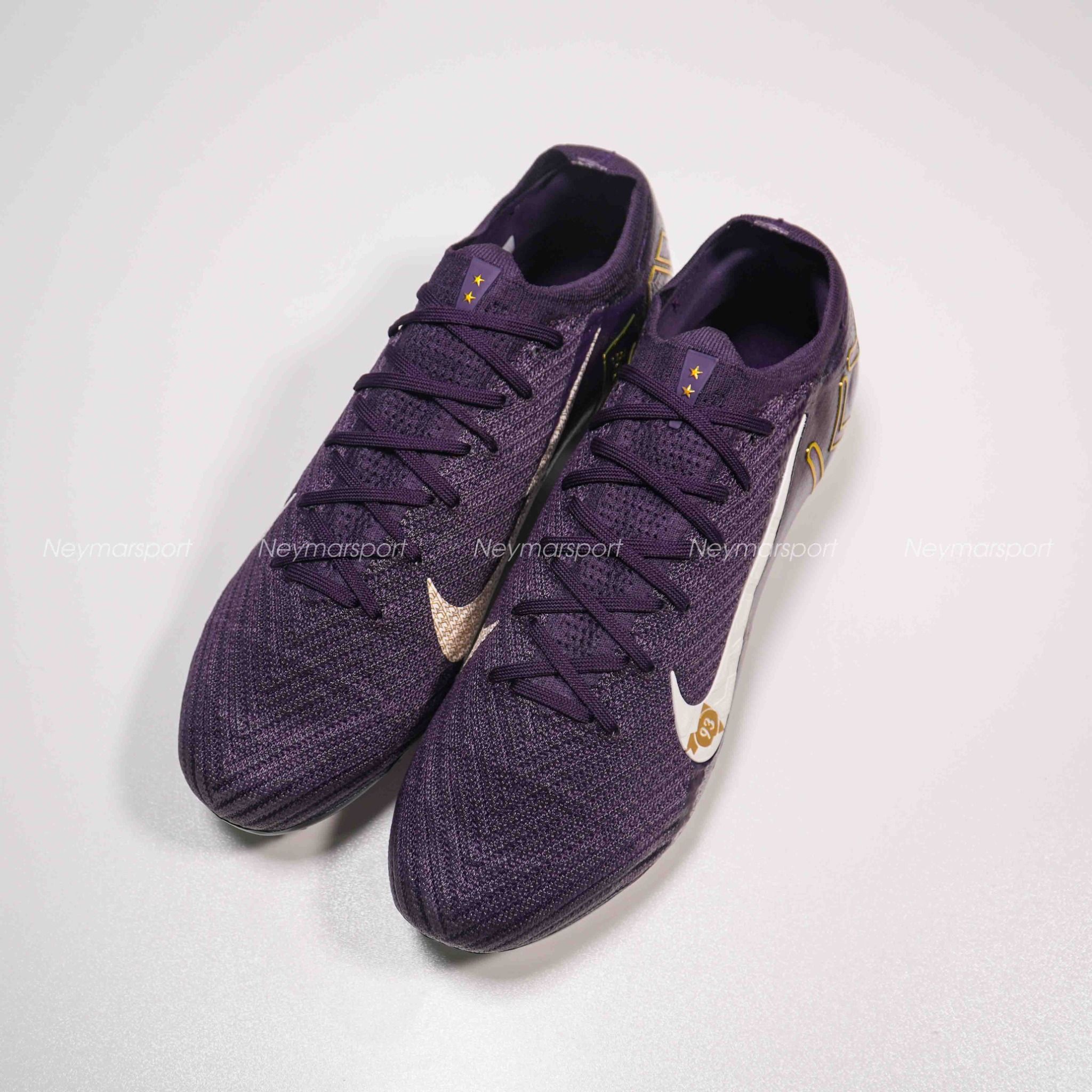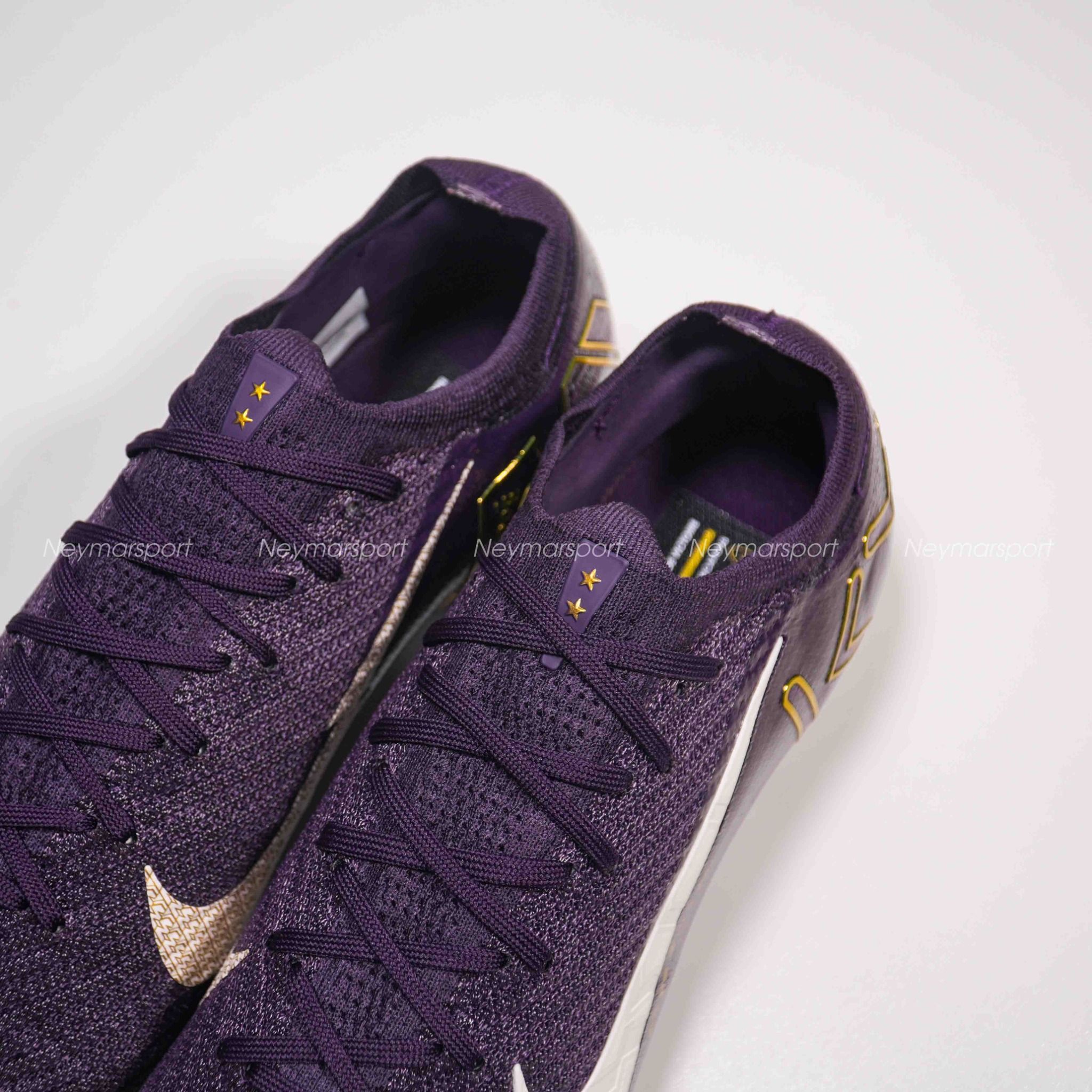 Phiên bản Mercurial Superfly/Vapor Mbappé khoác lên mình sắc tím "Grand Purple" sang trọng, kết hợp cùng màu kem "Pale Ivory" nhẹ nhàng ở phần đế giày và các chi tiết nhỏ. Lót giày bên trong được thiết kế tỉ mỉ với logo Mbappé cách điệu và hình ảnh những ngôi sao lấp lánh. Chúng tượng trưng cho tiềm năng vô hạn và khát vọng chinh phục đỉnh cao. Sự kết hợp màu sắc này toát lên vẻ ngoài vừa mạnh mẽ, vừa tinh tế, phù hợp với phong cách của Mbappé. Các chi tiết viền vàng kim loại góp phần tăng thêm vẻ sang trọng và đẳng cấp.