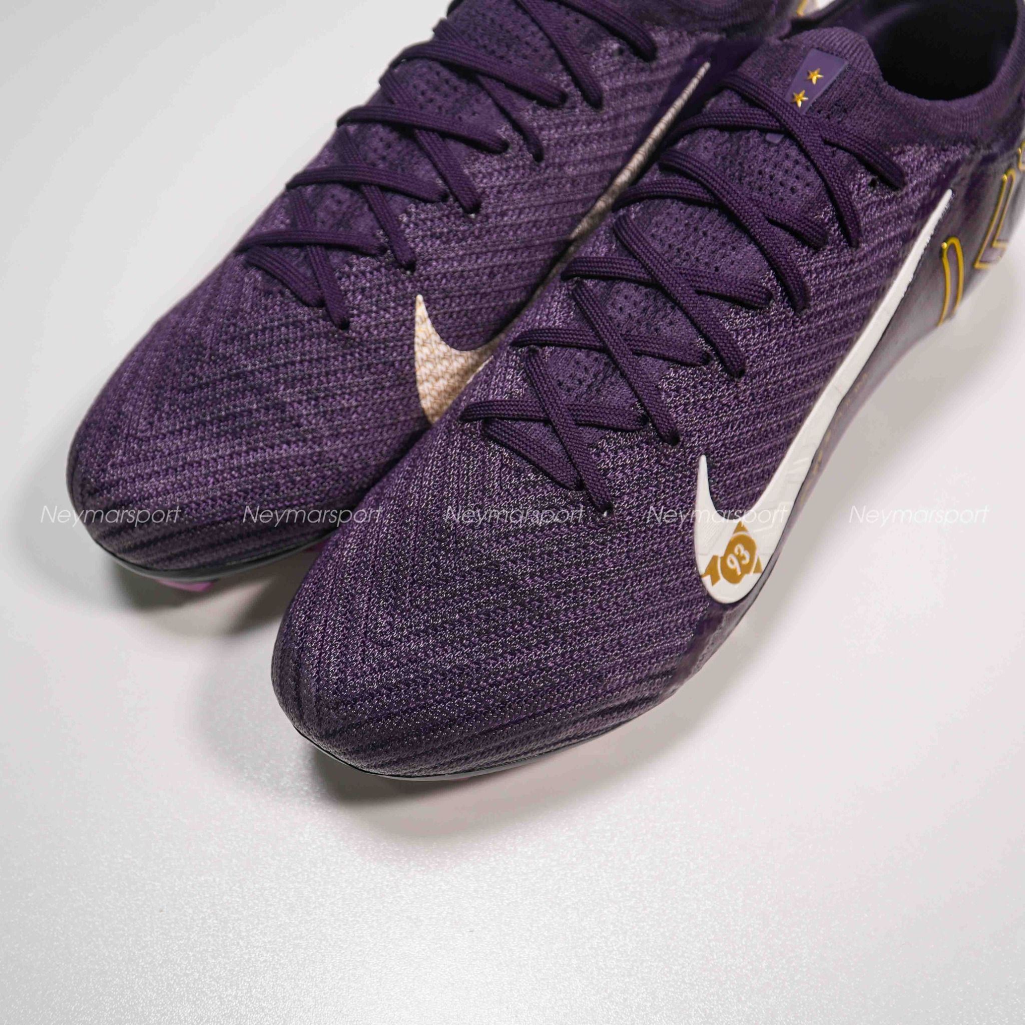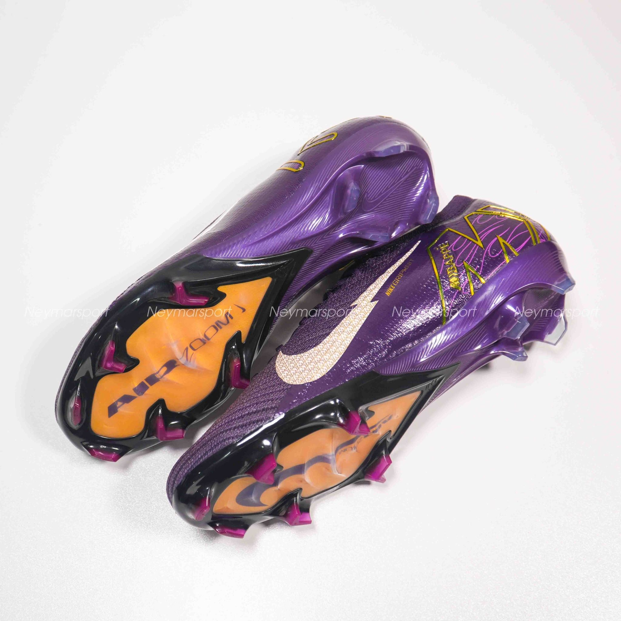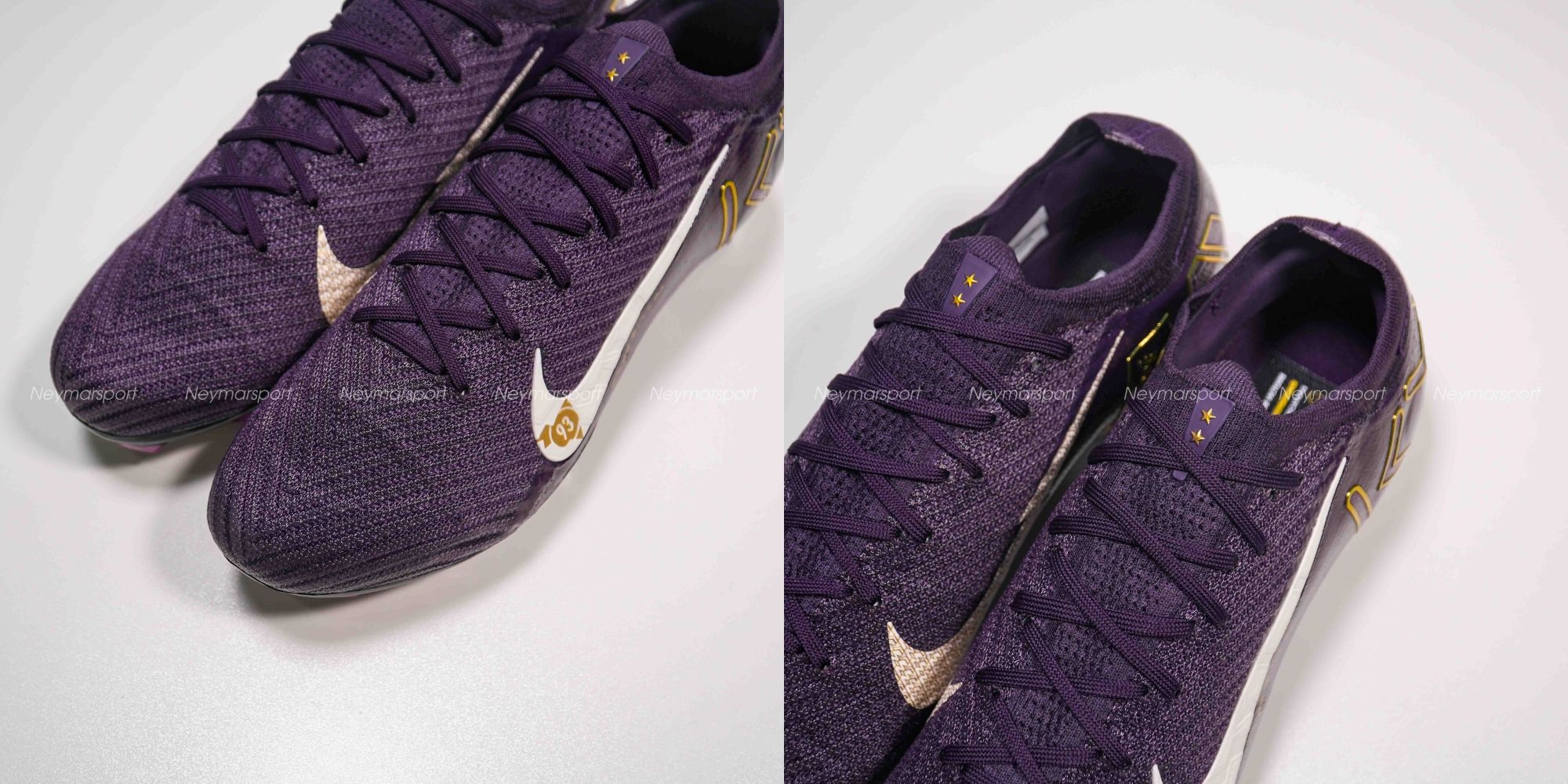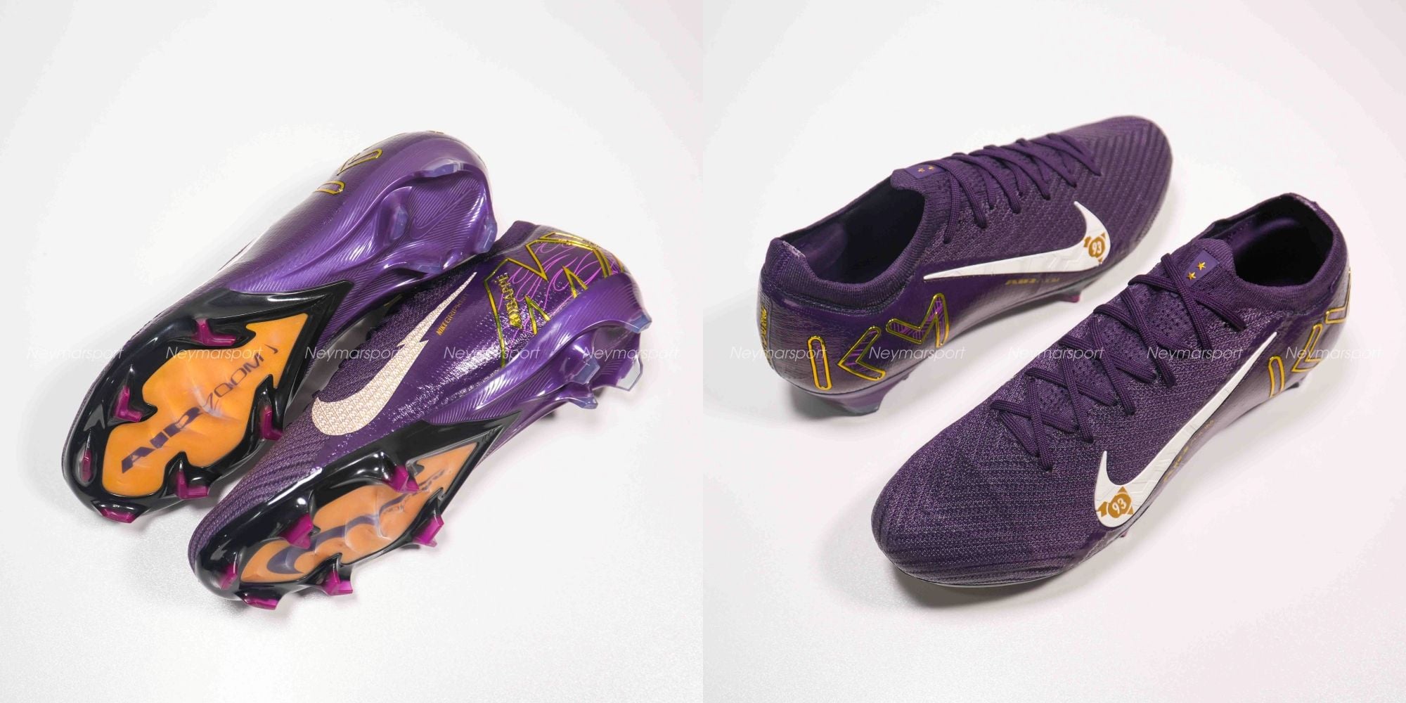 Phiên bản Mercurial Superfly/Vapor Mbappé khoác lên mình sắc tím "Grand Purple" sang trọng, kết hợp cùng màu kem "Pale Ivory" nhẹ nhàng ở phần đế giày và các chi tiết nhỏ. Lót giày bên trong được thiết kế tỉ mỉ với logo Mbappé cách điệu và hình ảnh những ngôi sao lấp lánh. Chúng tượng trưng cho tiềm năng vô hạn và khát vọng chinh phục đỉnh cao. Sự kết hợp màu sắc này toát lên vẻ ngoài vừa mạnh mẽ, vừa tinh tế, phù hợp với phong cách của Mbappé. Các chi tiết viền vàng kim loại góp phần tăng thêm vẻ sang trọng và đẳng cấp.