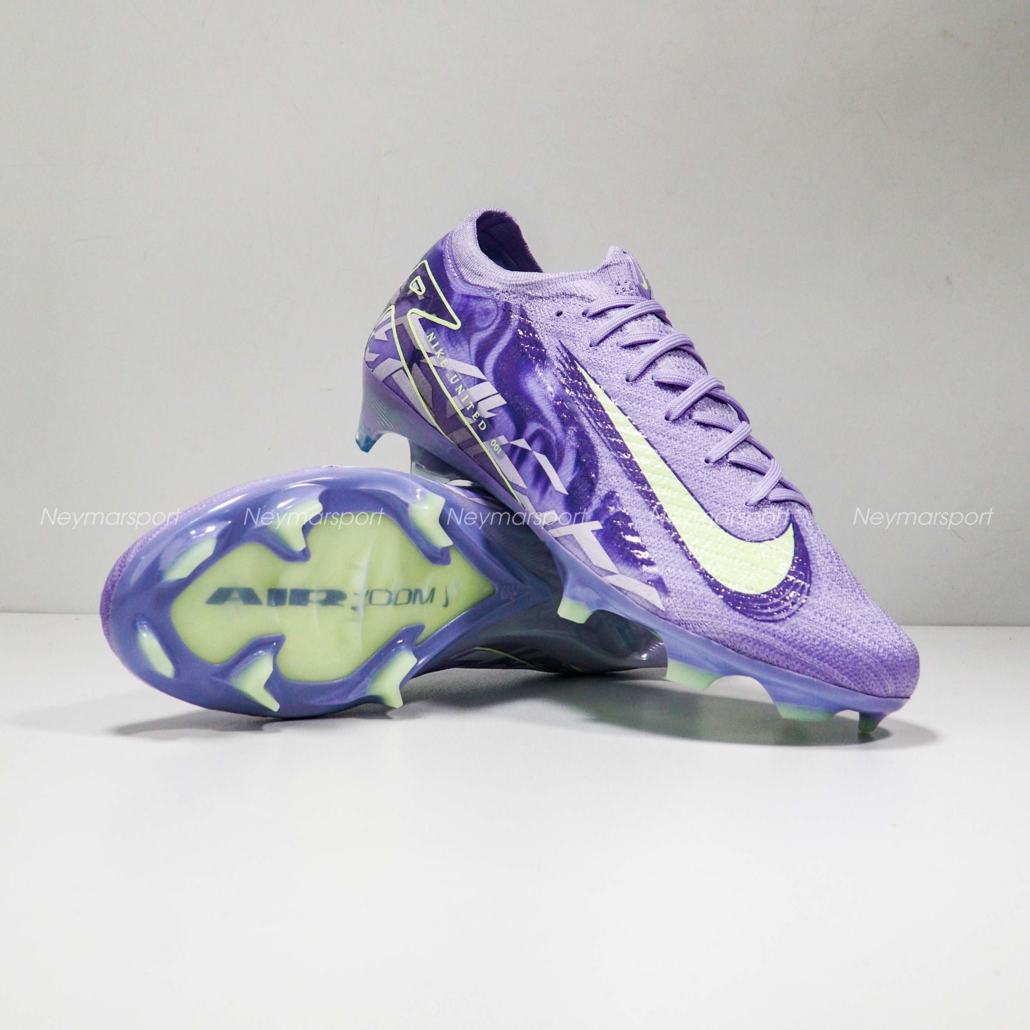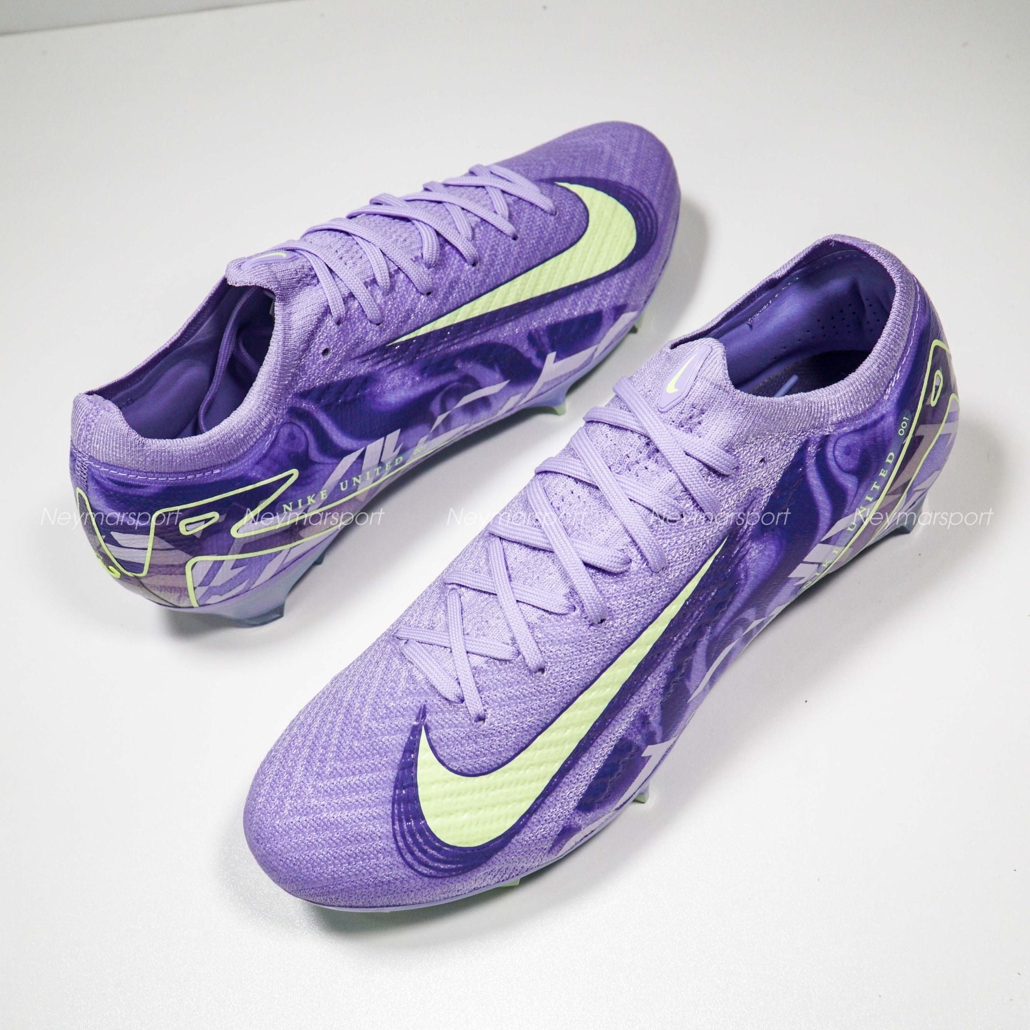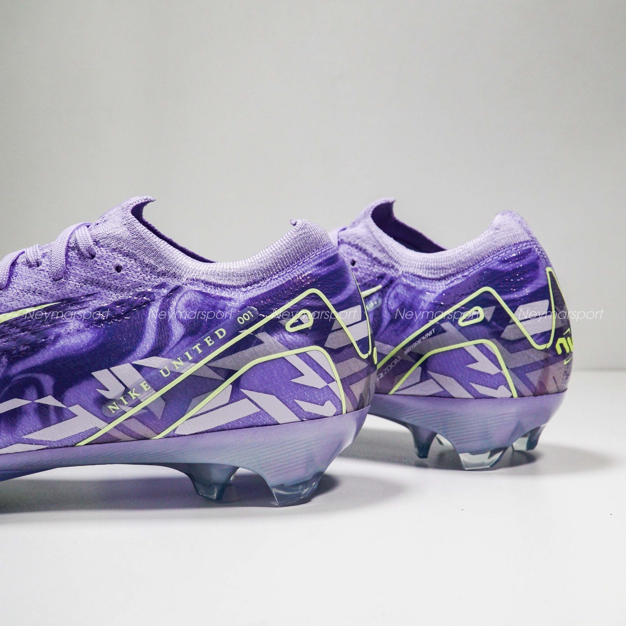 Giày đá bóng Nike Air Zoom Mercurial Vapor 16 Elite FG United - Purple Agate/Barely Volt HF1605-500 là phiên bản cao cấp dành chuyên cho sân cỏ tự nhiên 11 người. khoác lên mình gam màu "Purple Agate/Barely Volt" (tím oải hương/xanh volt nhạt) đầy ấn tượng trên cả ba dòng giày. Sắc tím oải hương chủ đạo kết hợp cùng các điểm nhấn xanh volt tạo nên một tổng thể hài hòa, phản ánh nguồn năng lượng mạnh mẽ của bóng đá nữ. Chi tiết dòng chữ "Nike United" màu xanh volt nổi bật trên thân giày càng làm tăng thêm sức hút cho thiết kế. Biểu tượng Swoosh đặc trưng của Nike cũng được phóng to, thể hiện sự đoàn kết và nâng đỡ lẫn nhau của phái nữ.