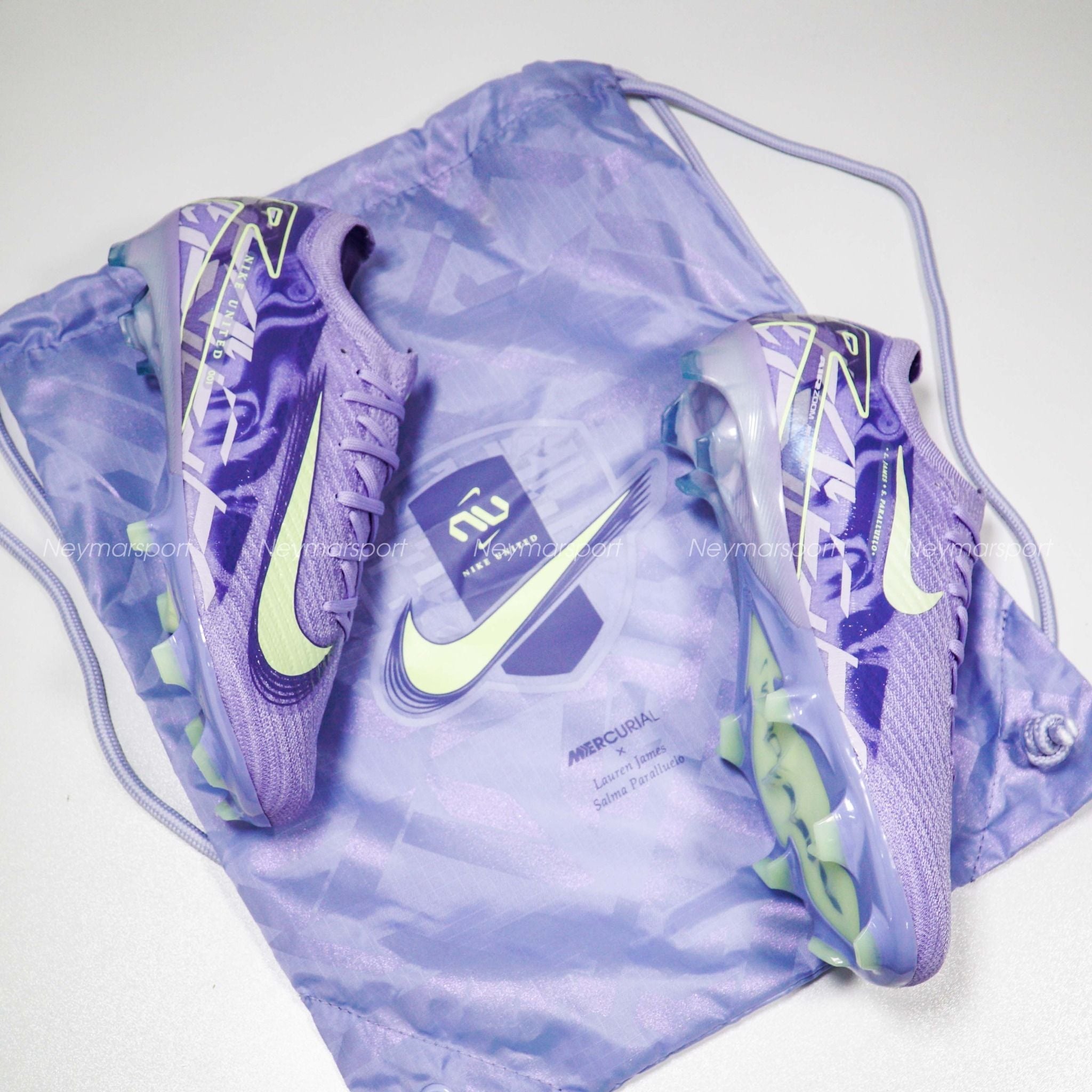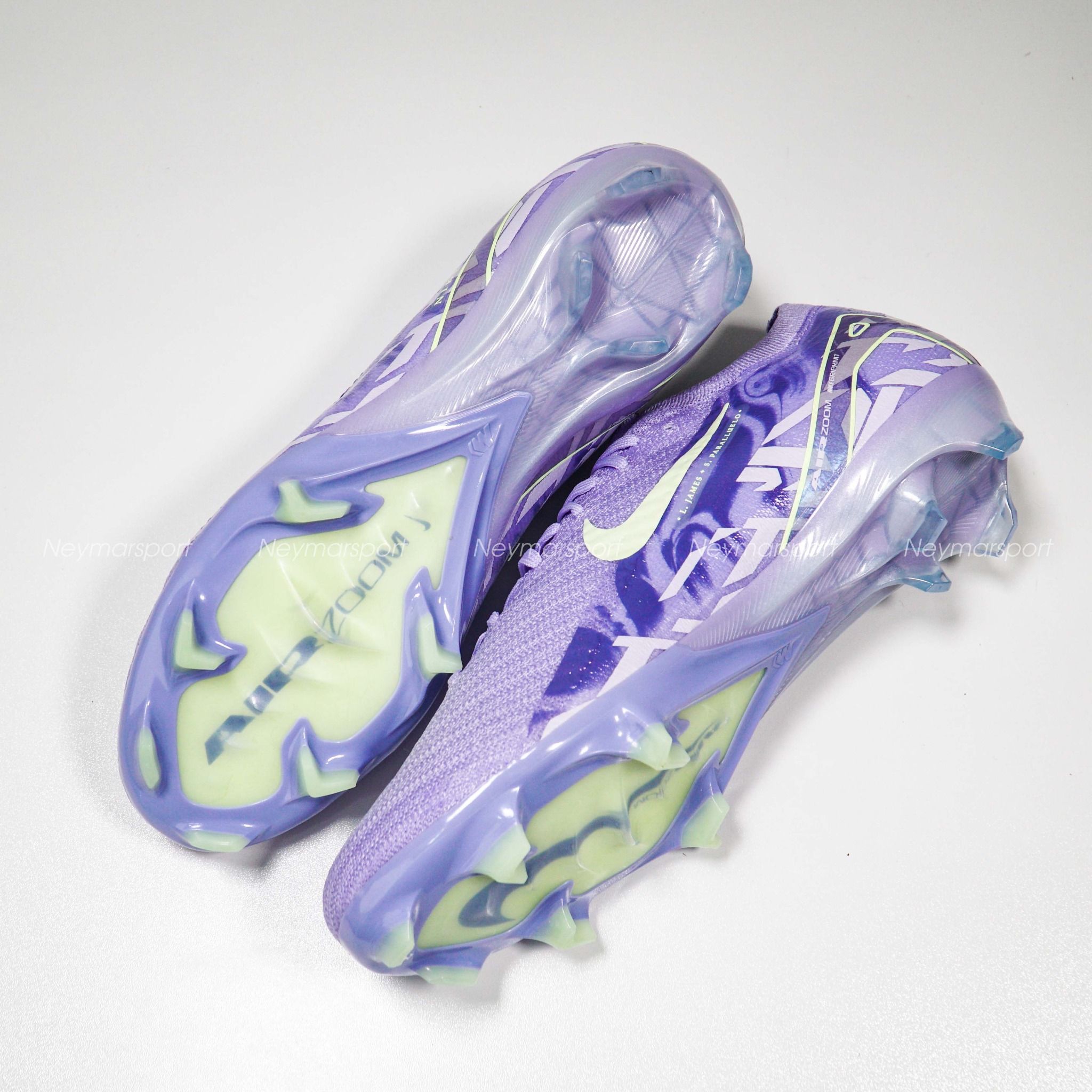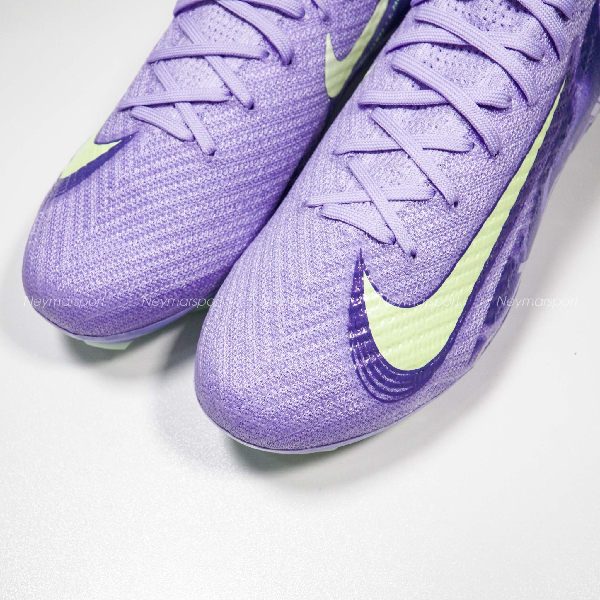 Giày đá bóng Nike Air Zoom Mercurial Vapor 16 Elite FG United - Purple Agate/Barely Volt HF1605-500 là phiên bản cao cấp dành chuyên cho sân cỏ tự nhiên 11 người. khoác lên mình gam màu "Purple Agate/Barely Volt" (tím oải hương/xanh volt nhạt) đầy ấn tượng trên cả ba dòng giày. Sắc tím oải hương chủ đạo kết hợp cùng các điểm nhấn xanh volt tạo nên một tổng thể hài hòa, phản ánh nguồn năng lượng mạnh mẽ của bóng đá nữ. Chi tiết dòng chữ "Nike United" màu xanh volt nổi bật trên thân giày càng làm tăng thêm sức hút cho thiết kế. Biểu tượng Swoosh đặc trưng của Nike cũng được phóng to, thể hiện sự đoàn kết và nâng đỡ lẫn nhau của phái nữ.