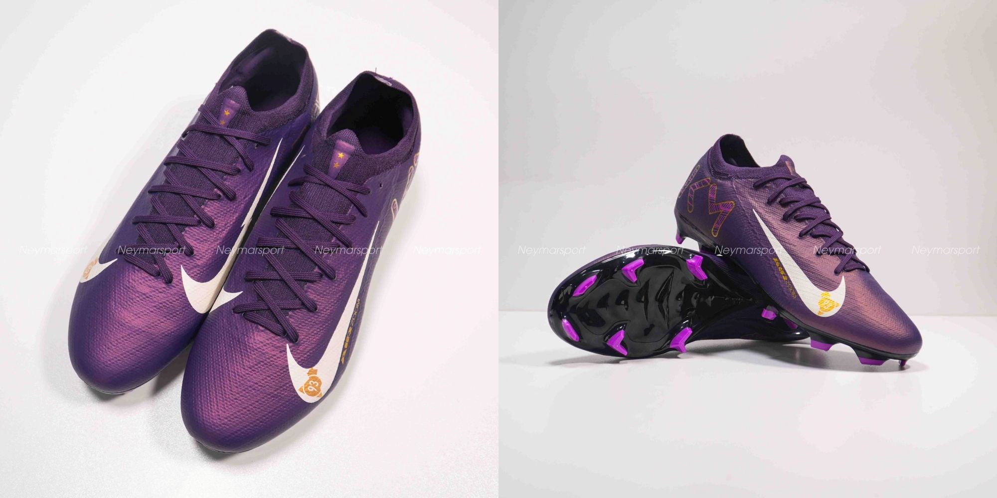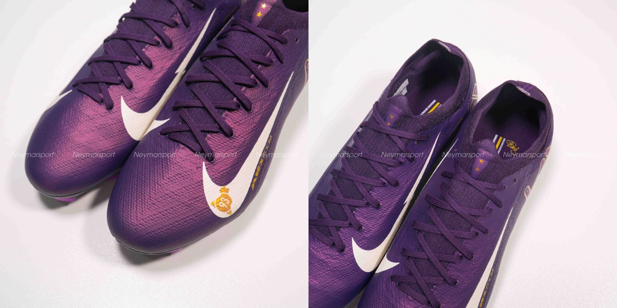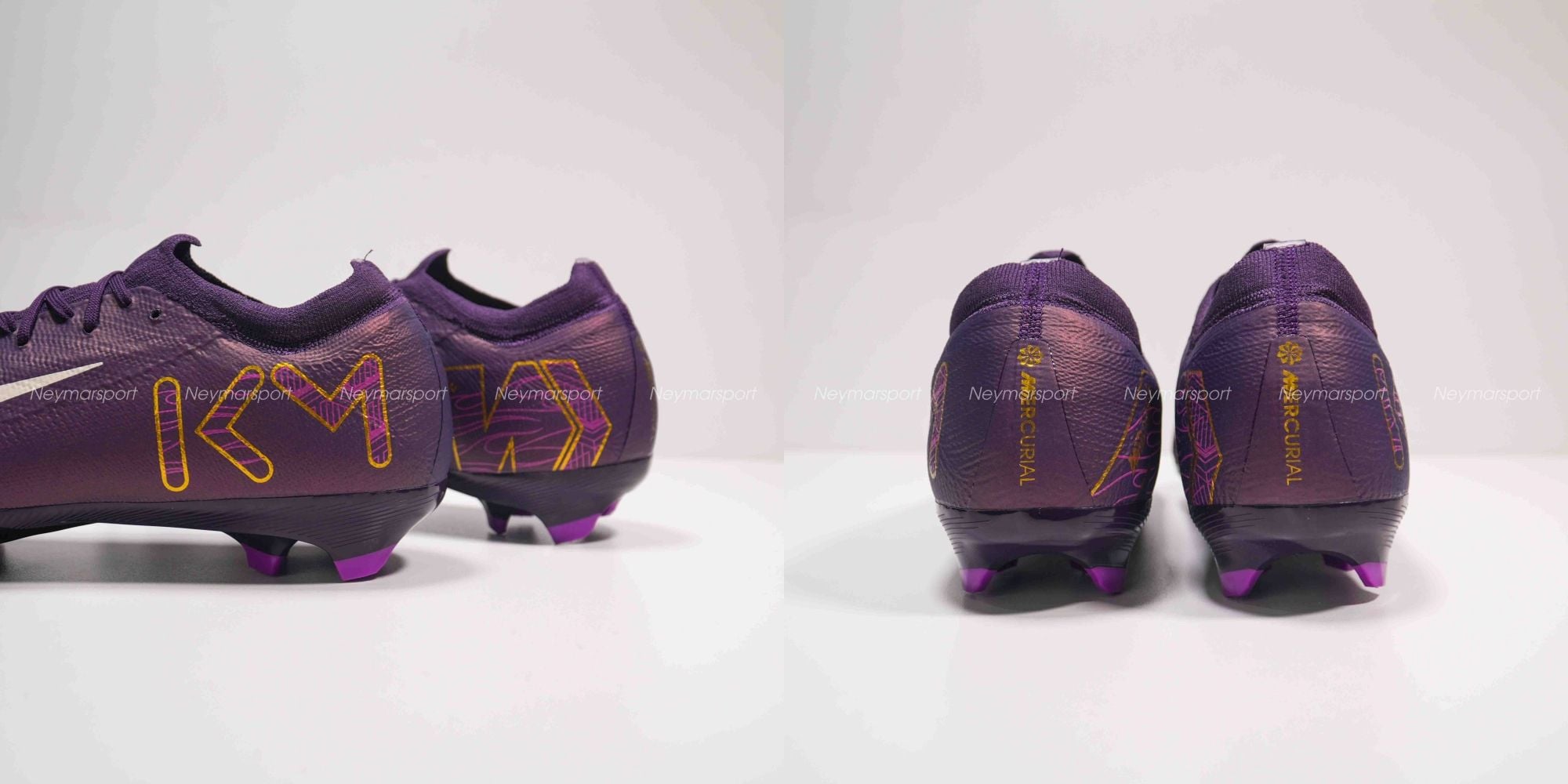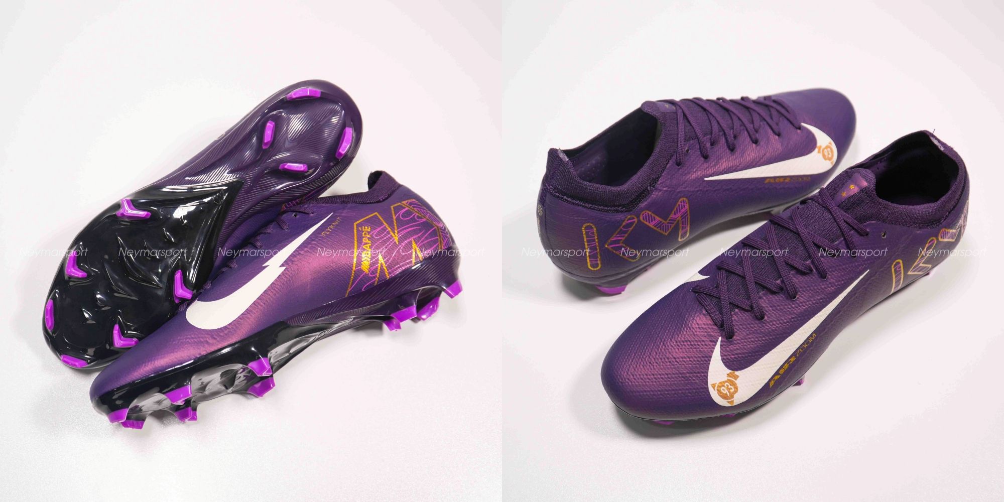 Phiên bản Mercurial Superfly/Vapor Mbappé khoác lên mình sắc tím "Grand Purple" sang trọng, kết hợp cùng màu kem "Pale Ivory" nhẹ nhàng ở phần đế giày và các chi tiết nhỏ. Lót giày bên trong được thiết kế tỉ mỉ với logo Mbappé cách điệu và hình ảnh những ngôi sao lấp lánh. Chúng tượng trưng cho tiềm năng vô hạn và khát vọng chinh phục đỉnh cao. Sự kết hợp màu sắc này toát lên vẻ ngoài vừa mạnh mẽ, vừa tinh tế, phù hợp với phong cách của Mbappé. Các chi tiết viền vàng kim loại góp phần tăng thêm vẻ sang trọng và đẳng cấp.