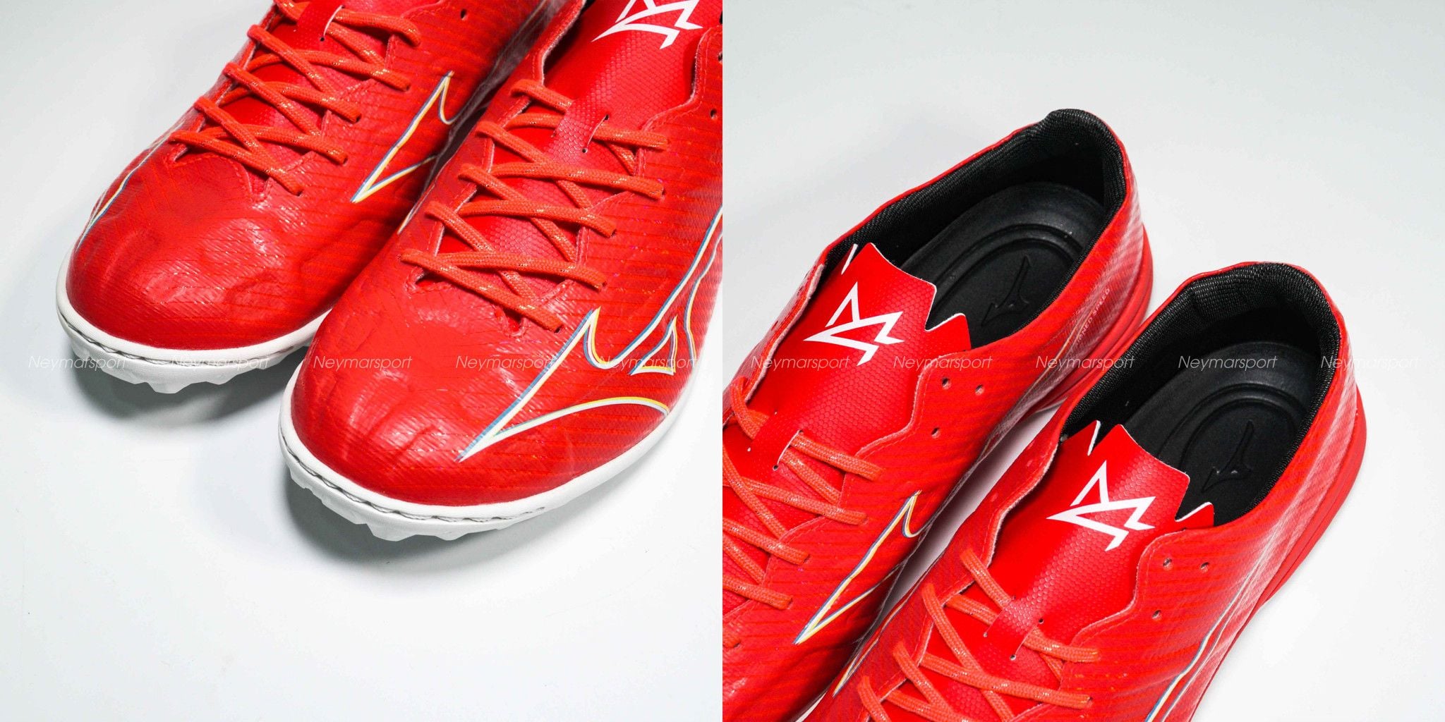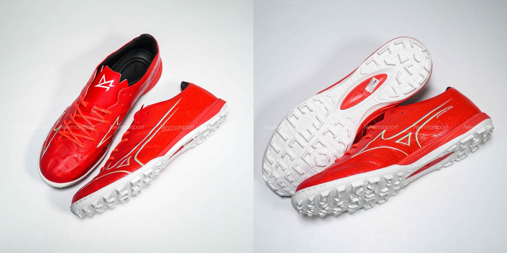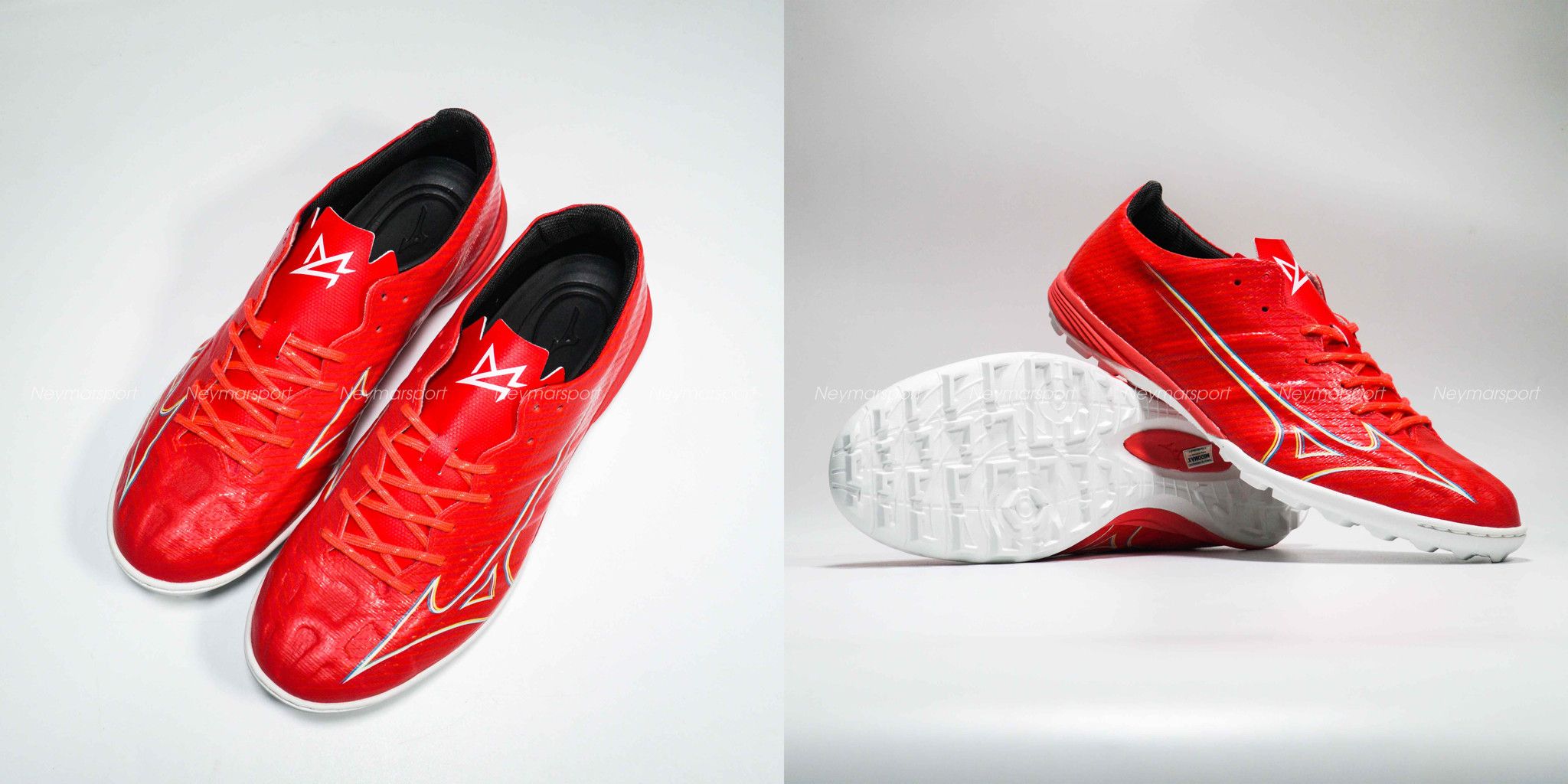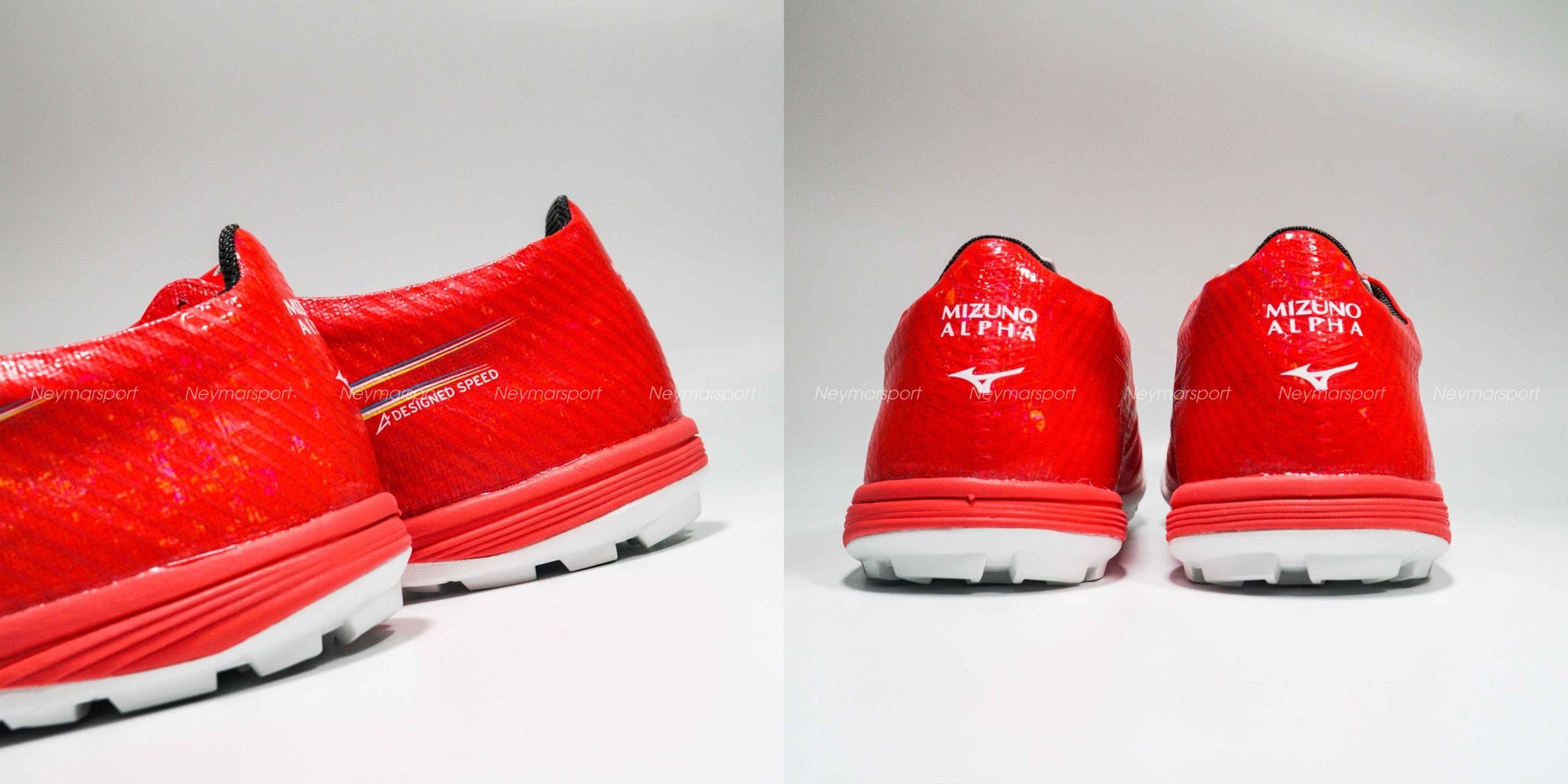 Mẫu giày đá bóng Mizuno Alpha lần này được phối bởi các gam màu Fiery Coral/White. Trên nền màu đỏ, logo của Mizuno được làm màu trắng nổi bật . Thiết kế độc đáo này mang đến cảm giác tốc độ sẵn sàng bùng nổ trong những đường chạy bóng bứt phá.