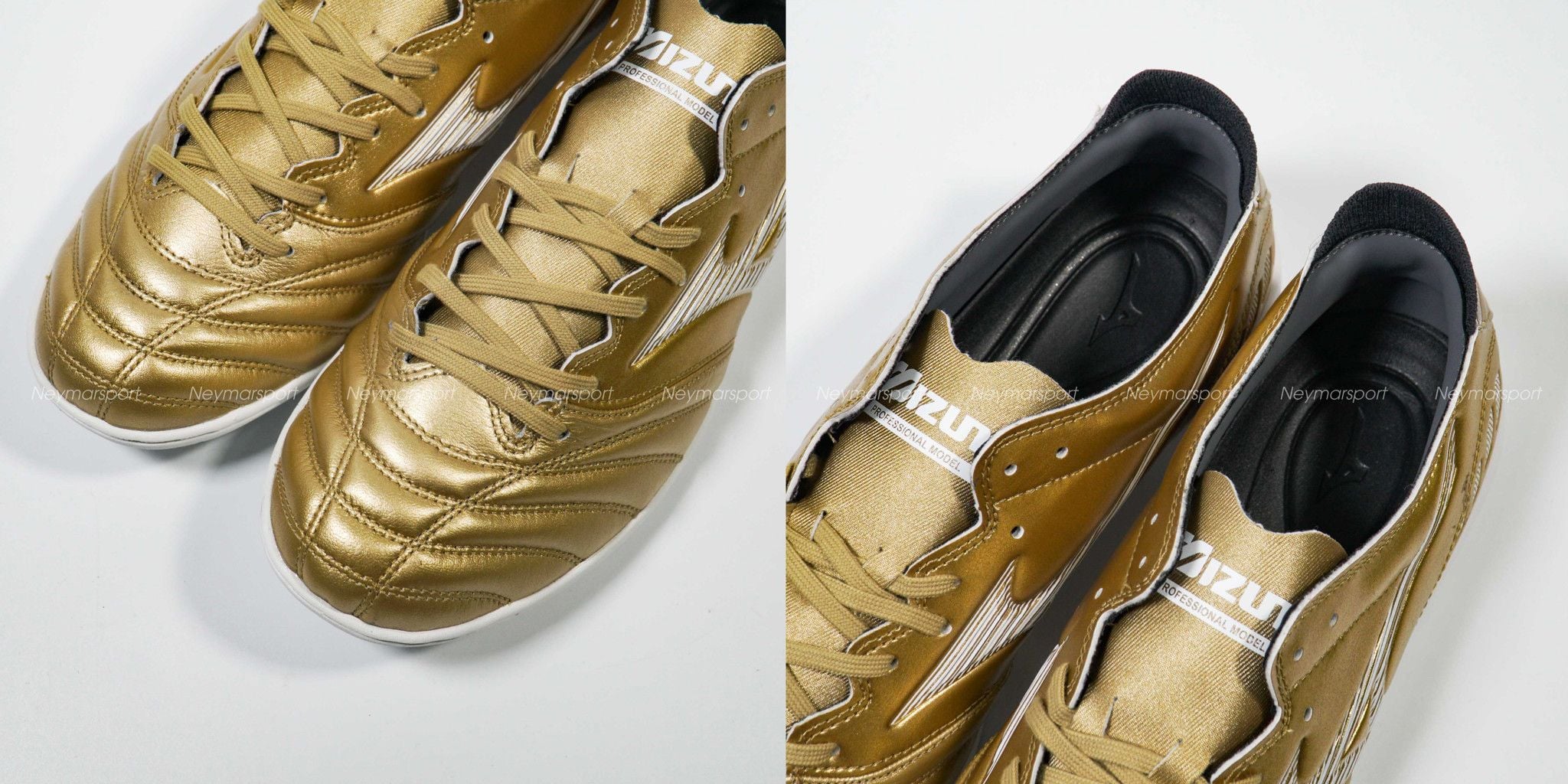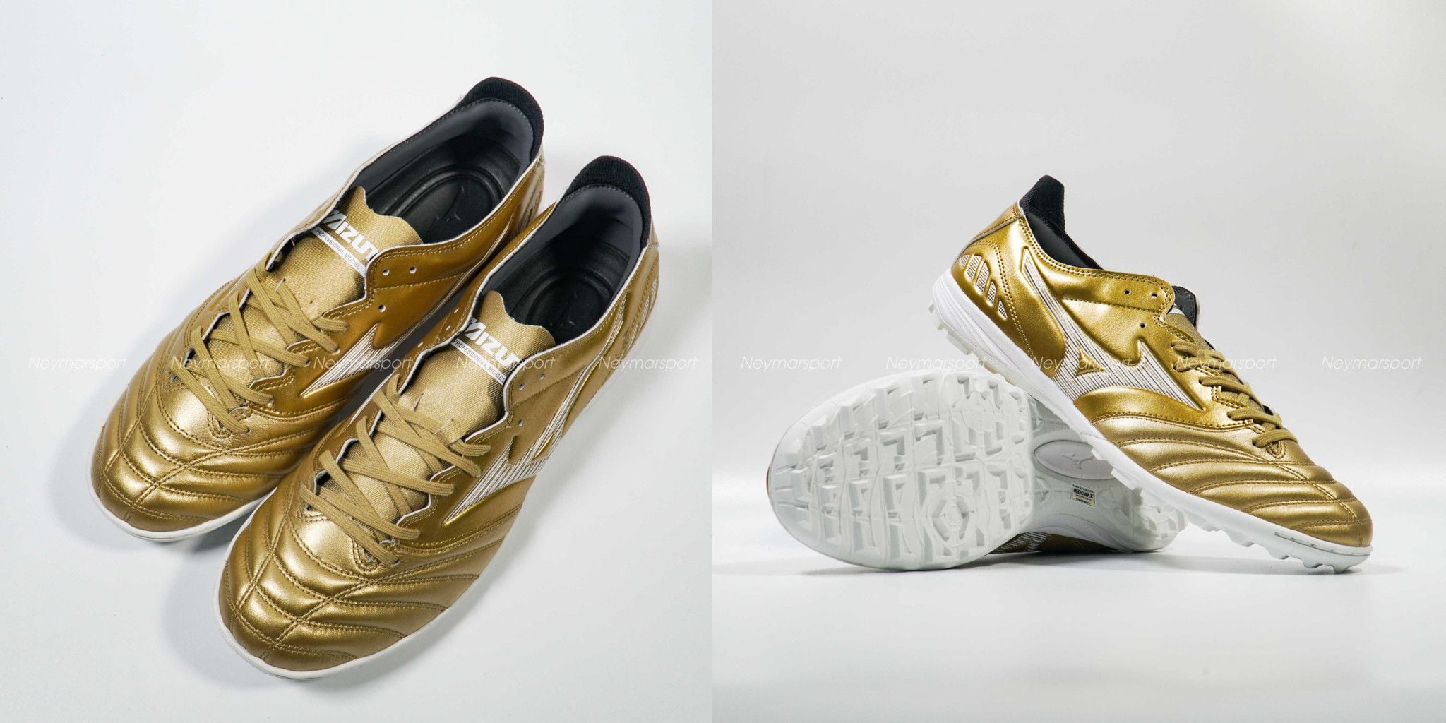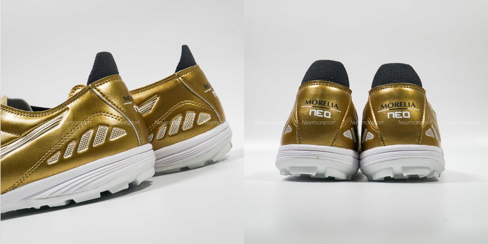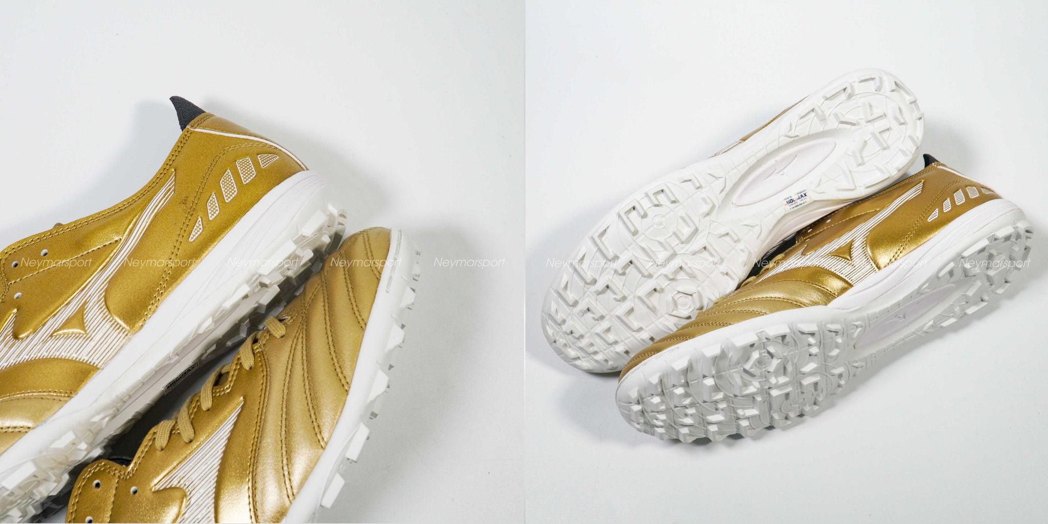 Mizuno Morelia Neo III Pro TF - Gold/White là mẫu giày chuyên cho sân cỏ nhân tạo 5-7 người. Mẫu giày này được các cầu thủ đánh giá rất cao vì sự toàn diện, bền bỉ và hỗ trợ các cầu thủ rất tốt. Những cầu thủ có lối chơi thiên về tốc độ và mong muốn một đôi giày nhẹ, êm ái, cảm giác bóng tốt không thể bỏ qua Mizuno Morelia Neo III Pro TF - Gold/White.