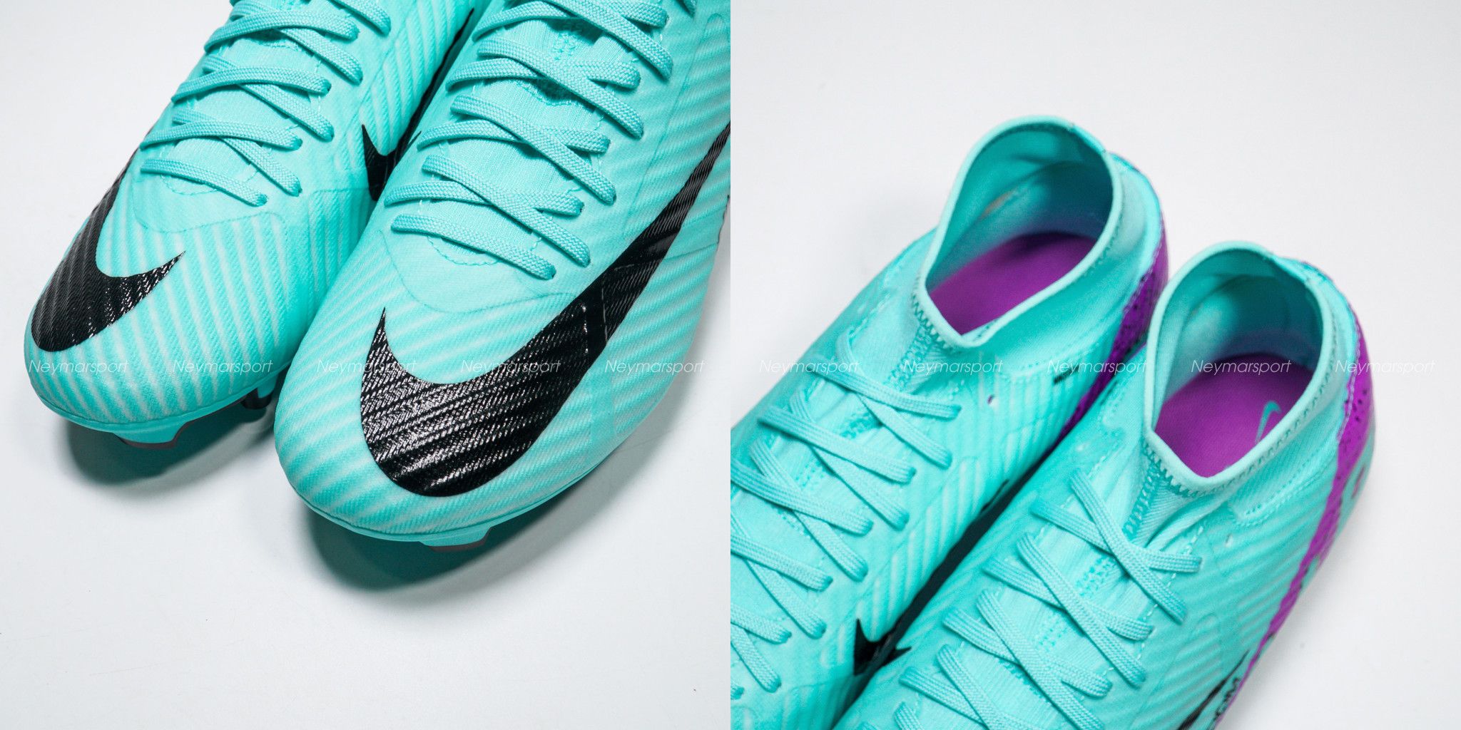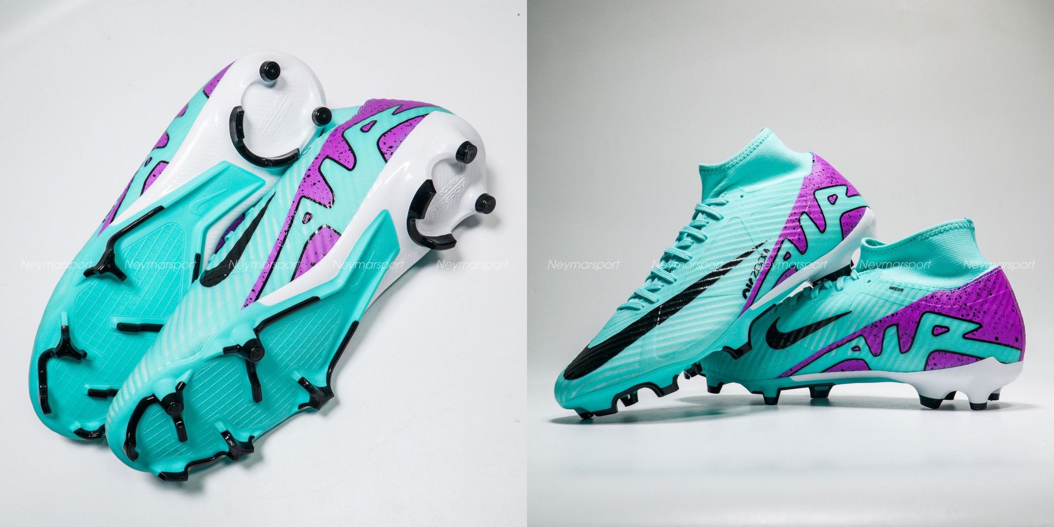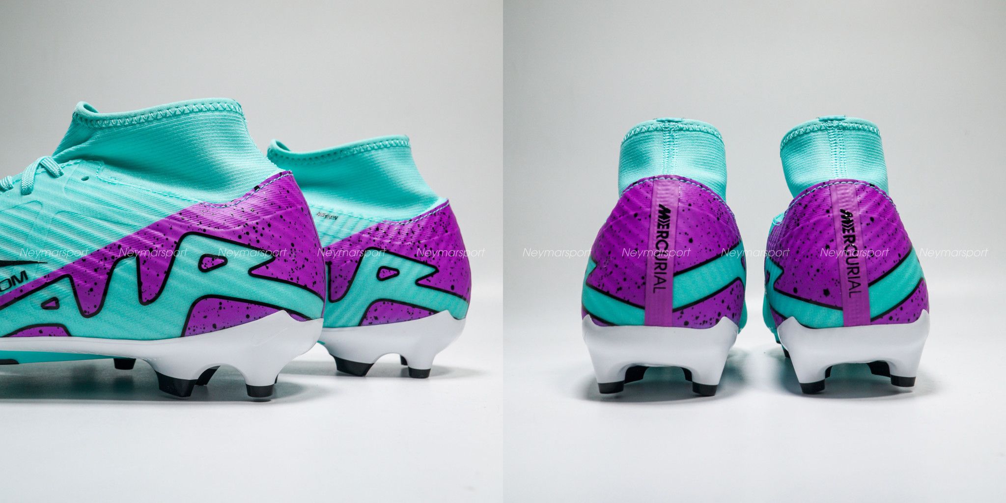 Giày đá bóng Nike Air Zoom Mercurial Superfly 9 Academy MG Peak Ready - Hyper Turquoise/Fuchsia Dream/Black/White DJ5625-300 là phiên bản giày phổ thông dành chuyên cho sân cỏ tự nhiên 11 người, 80% giày được tô điểm bằng màu xanh, kết hợp với logo đen nổi bật và thêm một vài họa tiết màu hồng phía gót giày tạo nên sự tinh tế và cá tính. SUPERFLY là tên gọi của các phiên bản cổ cao thường được CR7, Mbappe, Rashford ưa chuộng.