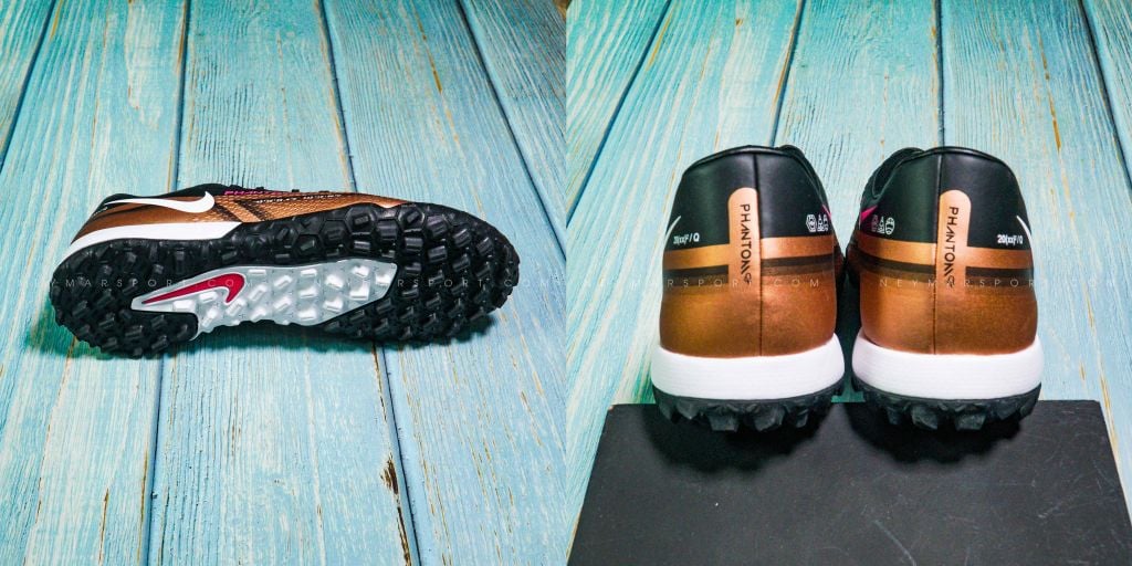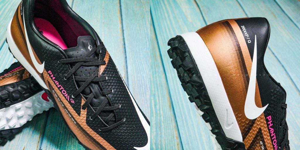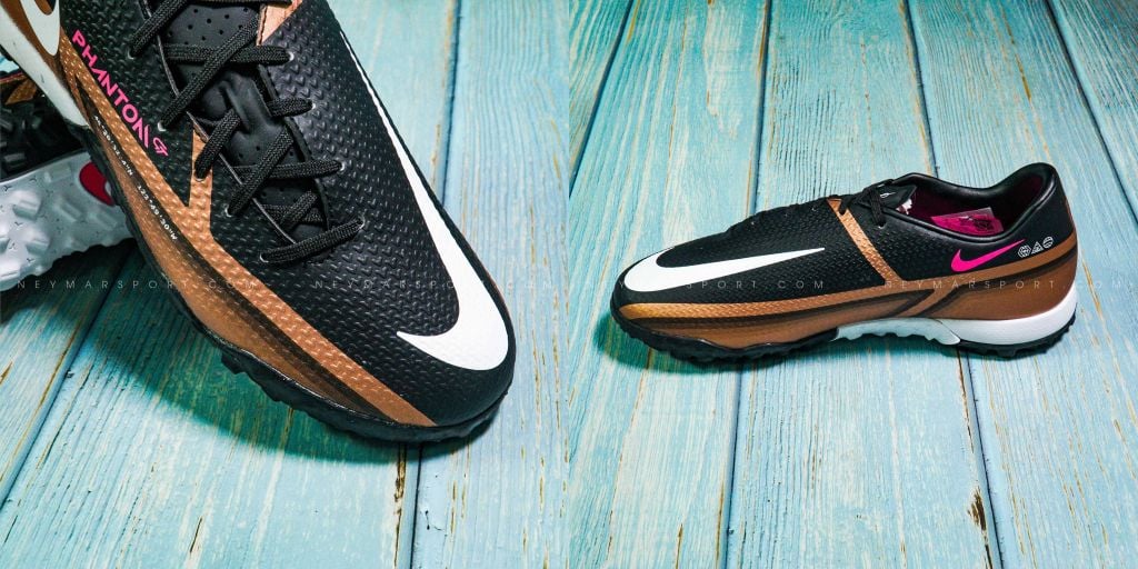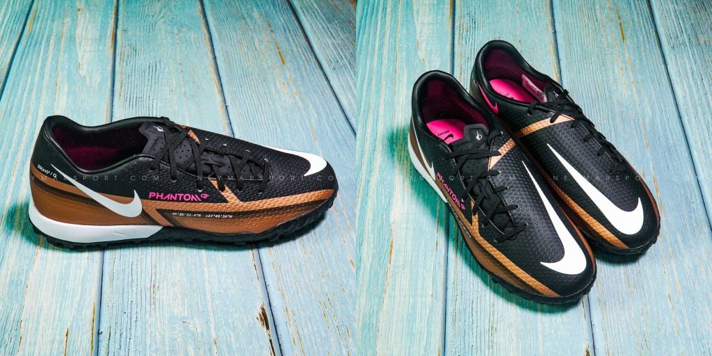 Nike Phantom GT 2 Academy TF Generation - Metallic Copper/White/Black là phiên bản giày dành cho sân cỏ nhân tạo 5-7 người. Phantom GT2 có màu sắc trầm với các gam màu White/Black/Pink Blast . Nike thay đổi phương thức phối màu, đưa màu đen lên làm chủ đạo và các chi tiết như phần dưới thân giày và logo được tạo điểm nhấn bằng màu đồng và màu trắng, tiếp tục tạo sự tương phản để nổi bật các họa tiết quan trọng.