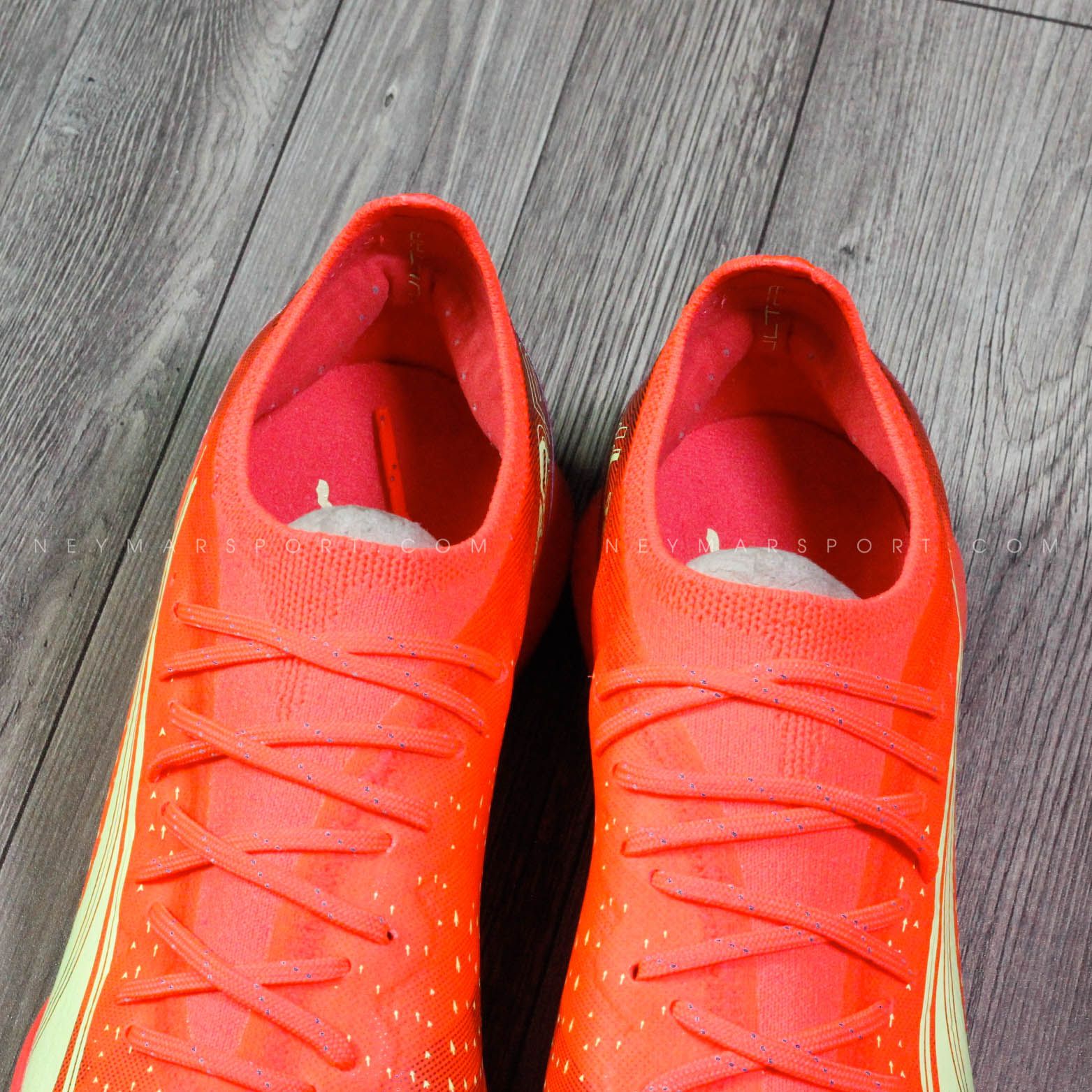 PUMA Ultra Ultimate Cage TF Fearless - Fiery Coral/Fizzy Light/PUMA Black là mẫu giày cao cấp dành cho sân cỏ nhân tạo 5-7 người. Với thiết kế gam màu chính thức của The Fearless là “Fiery Coral / Fizzy Light / Puma Black”. Với “Fizzy Light” xuất hiện trên nền “Fiery Coral”. Logo thương hiệu trên bàn chân trước và gót chân cũng thể hiện theo cùng một điểm nhấn “Fizzy Light”, đảm bảo một cái nhìn độc đáo.