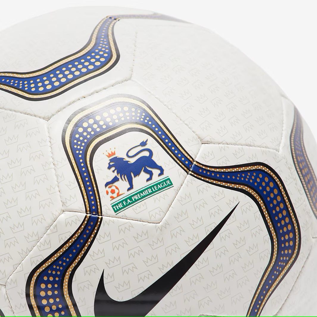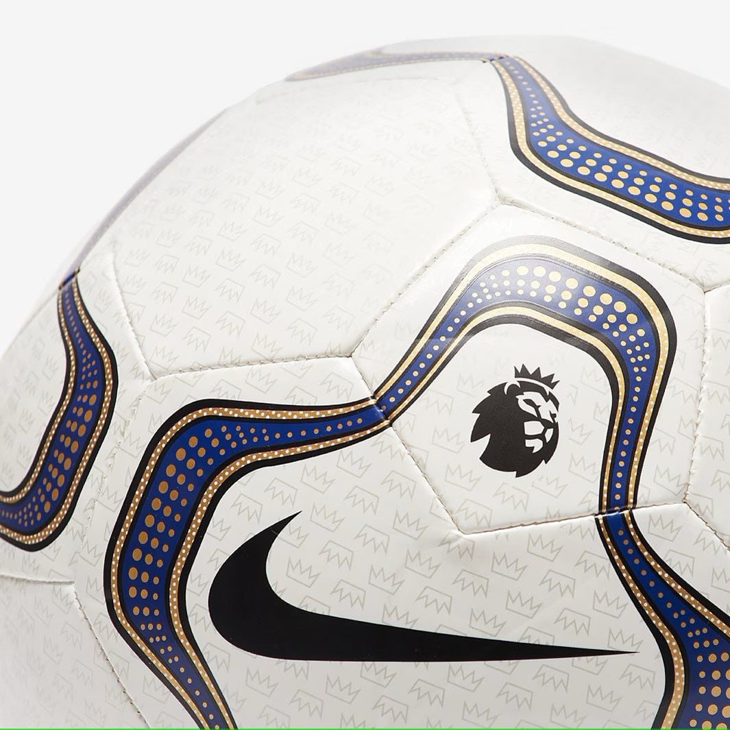 Kỷ niệm lịch sử Premier League với Quả bóng đá Nike Premier League 24/25 Heritage Geo Merlin màu Trắng/Xanh dương/Vàng/Đen, một sự hồi tưởng dựa trên quả bóng Premier League đầu tiên của Nike.