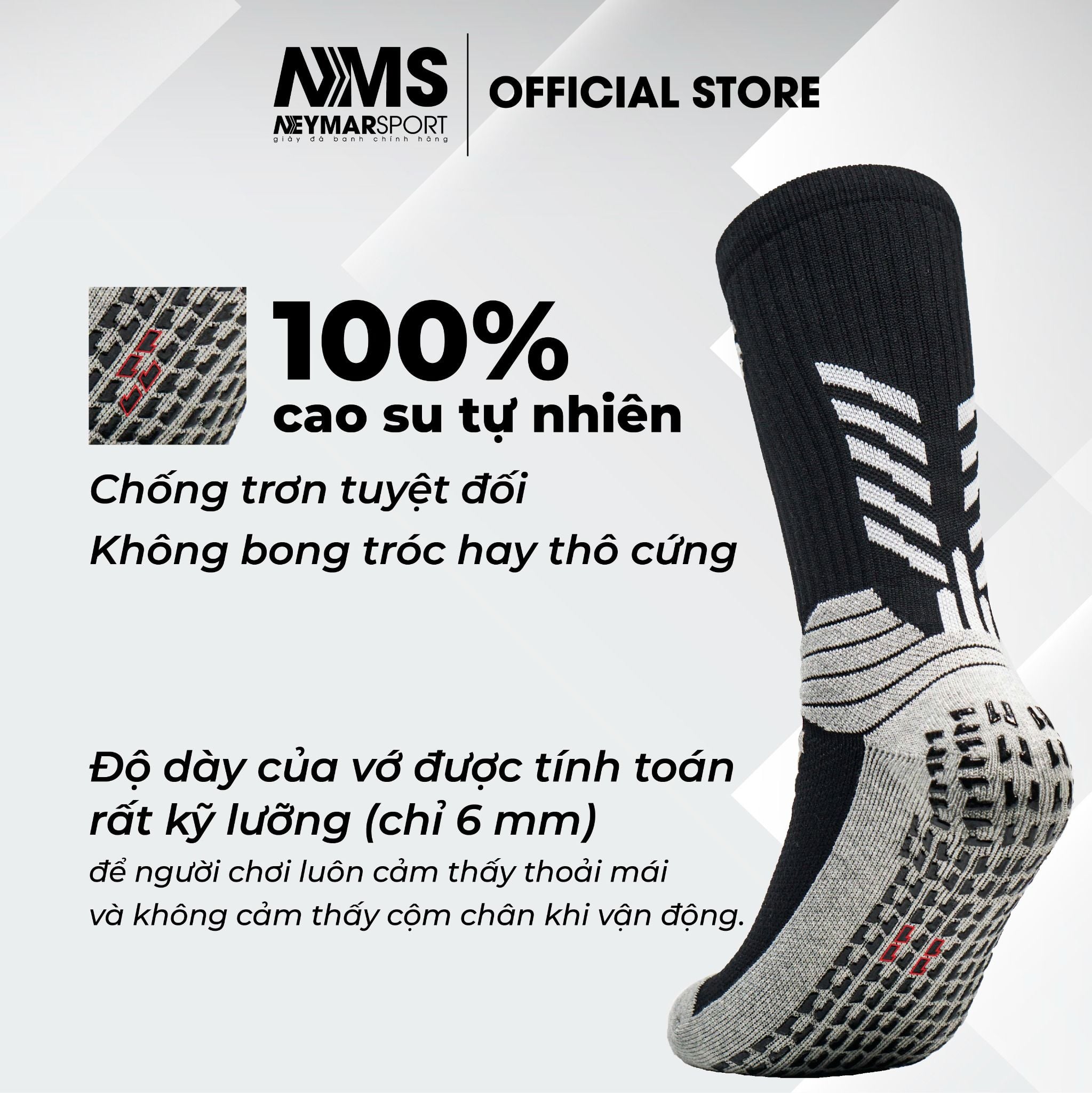 ✔️Tuy có thêm lớp vân cao su nhưng độ dày của vớ được tính toán rất kỹ lưỡng (chỉ 6mm), để người chơi luôn cảm thấy thoải mái và không cảm thấy cộm chân khi vận động.