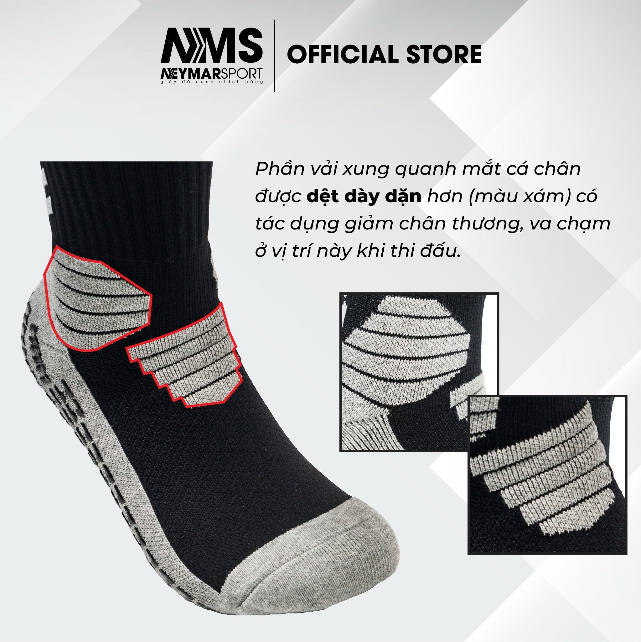 Phần vải xung quanh mắt cá chân được dệt dày dặn hơn (màu xám) có tác dụng giảm chân thương, va chạm ở vị trí này khi thi đấu.